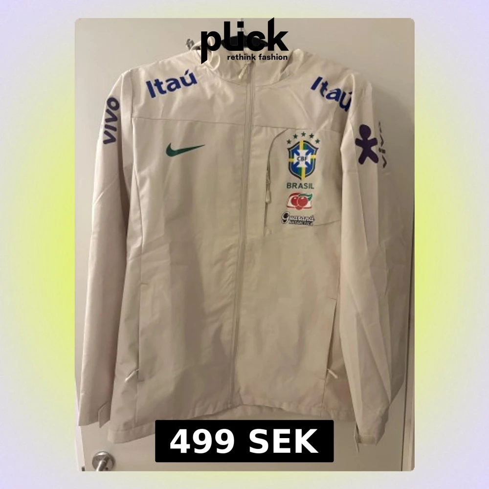 Snygg beige vindjacka från Nike med Brasil-logga och sponsormärken som Itaú och Vivo. Jackan har huva, hel dragkedja framtill och lång ärm. Materialet är lätt och syntetiskt, perfekt för dig som gillar sportig stil och fotboll. Använd 1 gång
