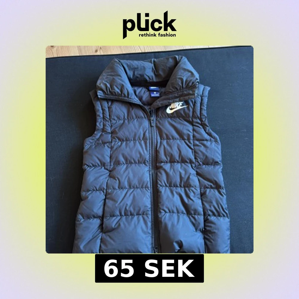 Snygg svart dunväst från Nike med hög krage och dragkedja framtill. Västen har quiltad design och ett vitt Nike-logga på bröstet. Perfekt att slänga över en hoodie för en sportig look. Materialet är syntet och dun, vilket gör den både lätt och varm.
