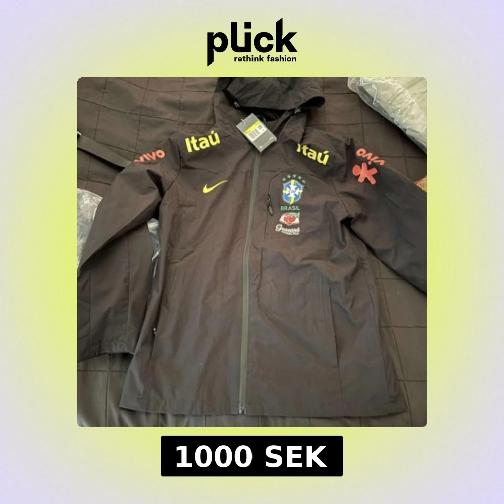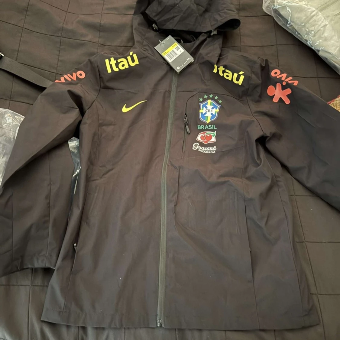 Svart vindjacka från Nike med Brasil-logga och sponsormärken som Itaú och Vivo. Jackan har huva, hel dragkedja och tryckta detaljer i gult och rött. Perfekt för dig som gillar fotboll och vill ha en sportig look.