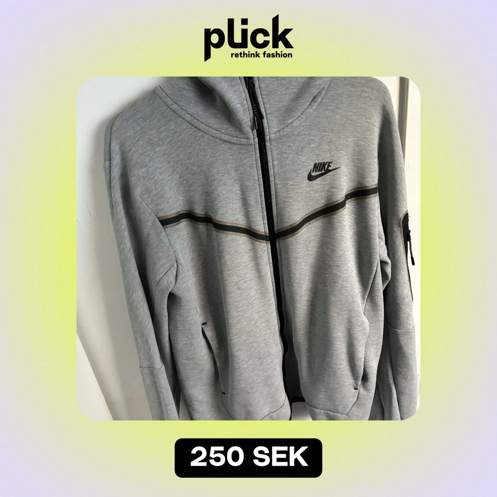 Säljer en grå hoodie från Nike i bra skick. Den har en dragkedja framtill och en svart randdetalj över bröstet. Perfekt för höst och vår, med långa ärmar och en bekväm passform. Huvan ger extra mysfaktor. Passar både till träning och vardag.