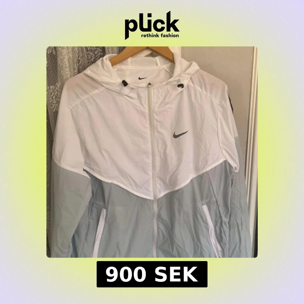 Nike vindjacka i vitt och ljusgrått med huva och dragkedja framtill. Jackan har snörning i huvan, två fickor med dragkedja och klassisk Nike-logga på bröstet. Perfekt för blåsiga dagar och sportiga outfits.