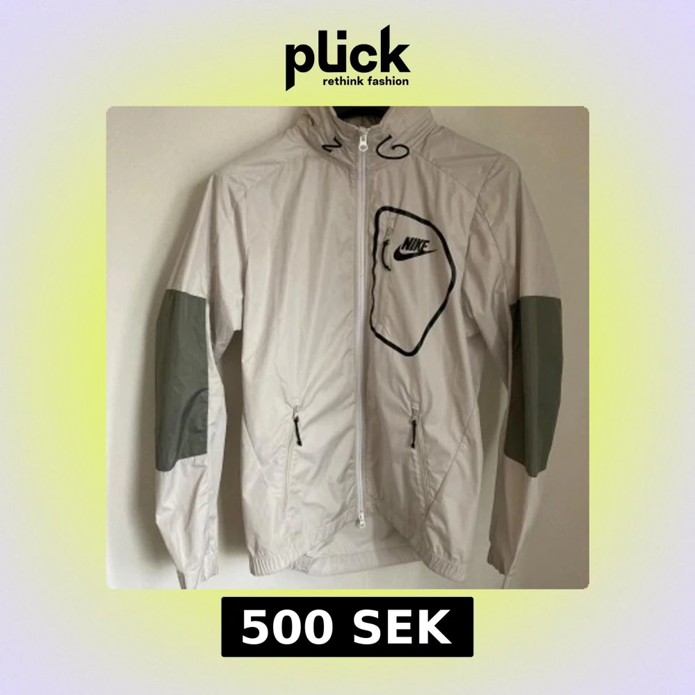 Nike jacka beige storlek S Köpt på Intersport för många år sedan Använd en del Liten fläck på insidan av jackan Krage med luva inuti Bröstvidd 54 cm x 2 = 108 cm Längd fram 70 cm Längd bak 74 cm