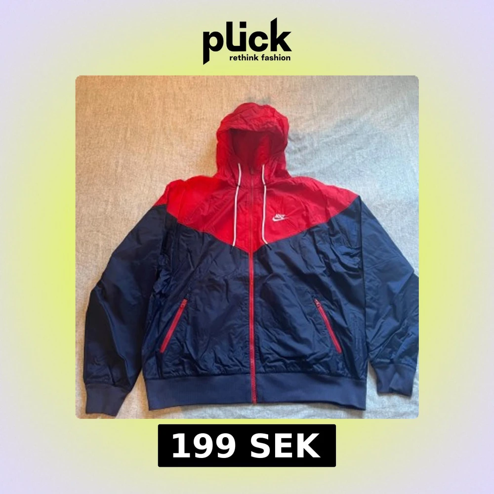 Nike vindjacka med huva i rött och marinblått, perfekt för blåsiga dagar. Säljer jackan för att jag är inte i behov av den längre. Vid snabb affär kan priset diskuteras!