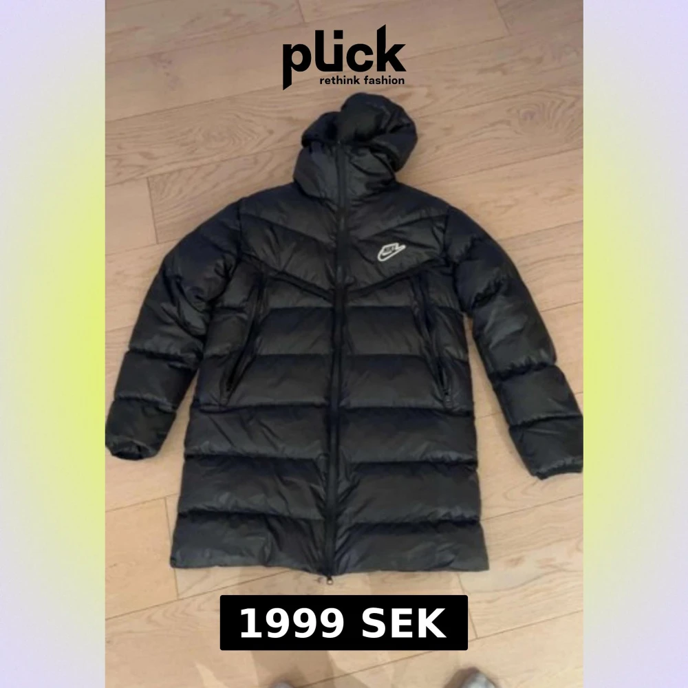 Säljer en svart lång dunjacka från Nike med huva och diskret logga på bröstet. Jackan har quiltad design och dragkedja framtill. Perfekt för kalla dagar när du vill hålla dig varm och ändå se chill ut.