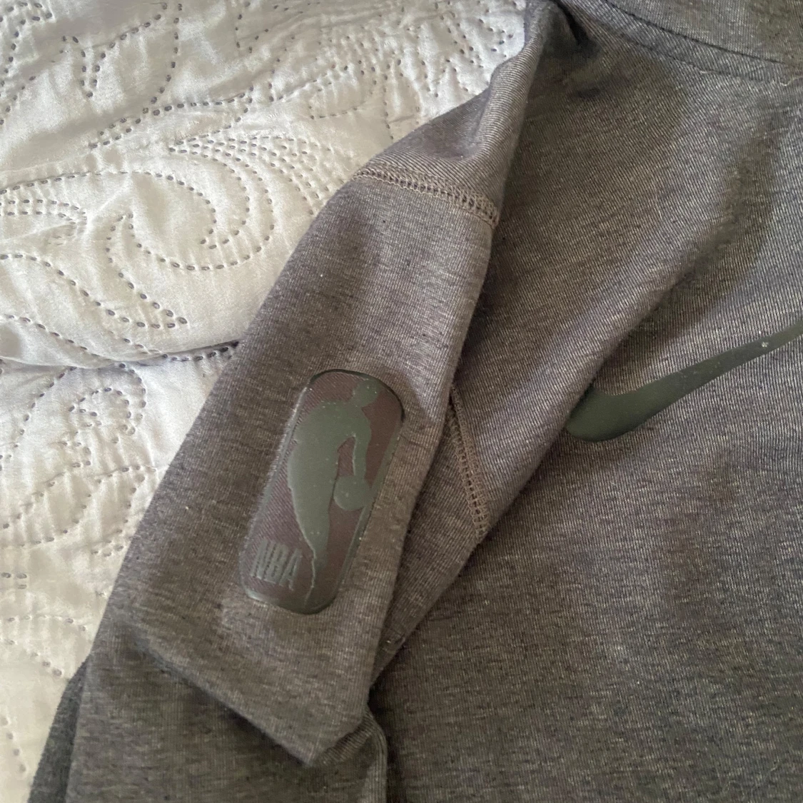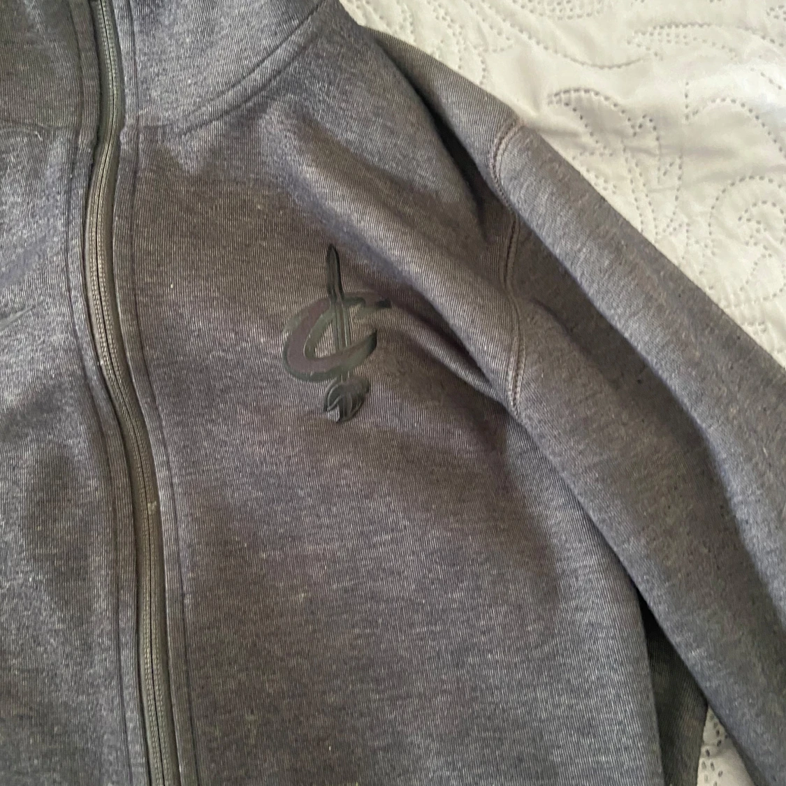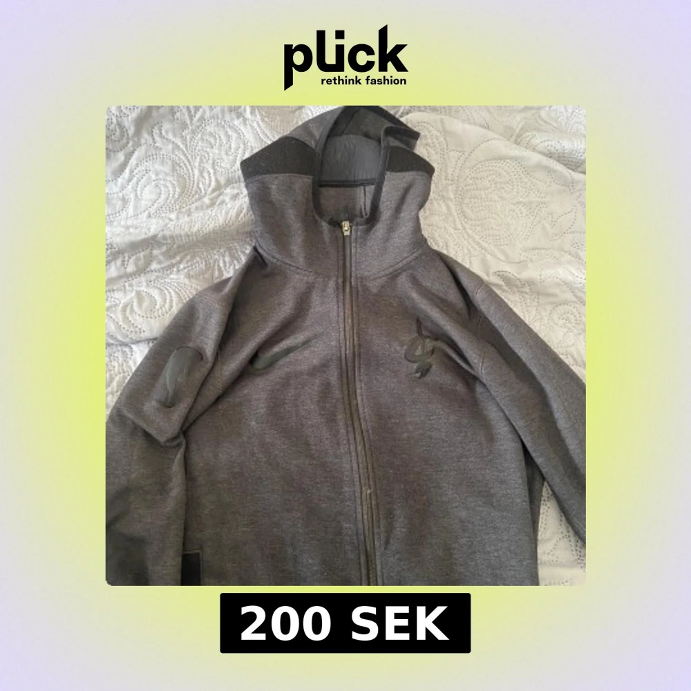 Säljer en grå hoodie från Nike med dragkedja och huva. Den har ett stilrent tryck på bröstet och ett NBA-märke på ärmen. Perfekt för en sportig look eller avslappnade dagar.