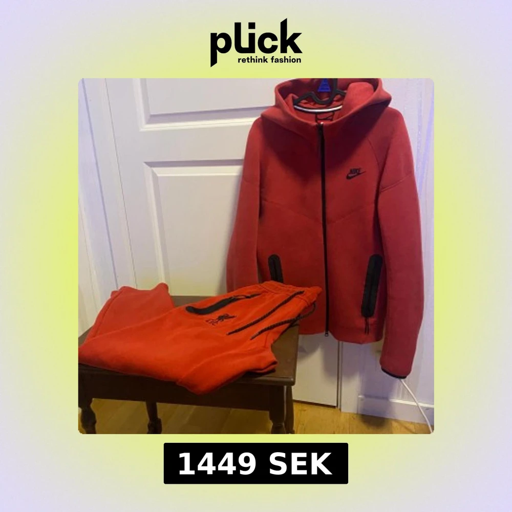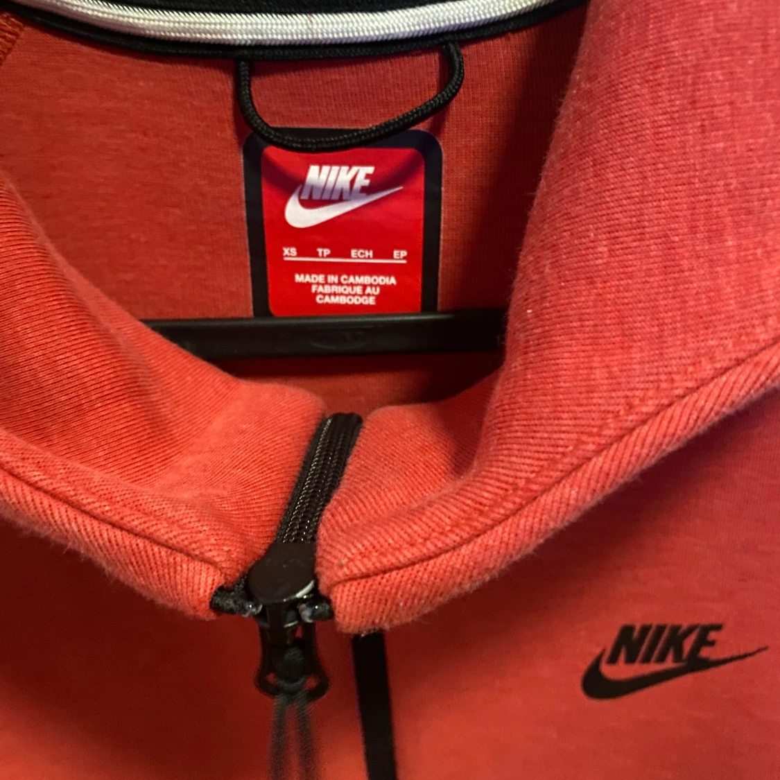 Nike hoodiejacka i röd färg med svart logga på bröstet och svarta detaljer vid fickorna. Jackan har hel dragkedja framtill, huva och långa ärmar. Materialet är mjukt och känns som bomull, perfekt för chill eller träning. Snygg streetstil med sportig vibe.