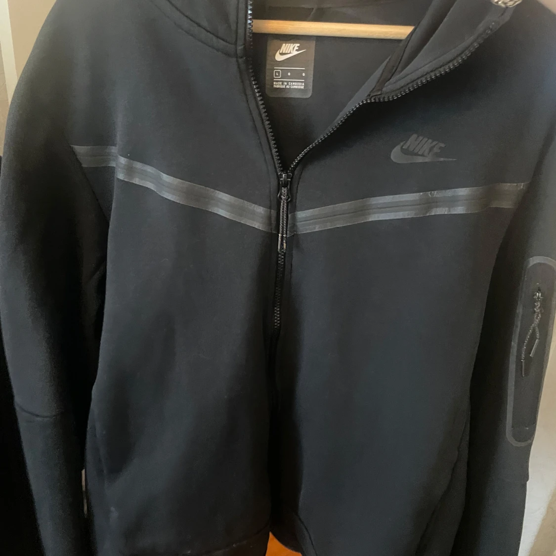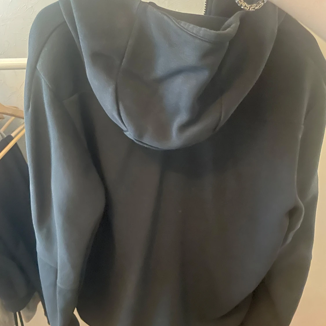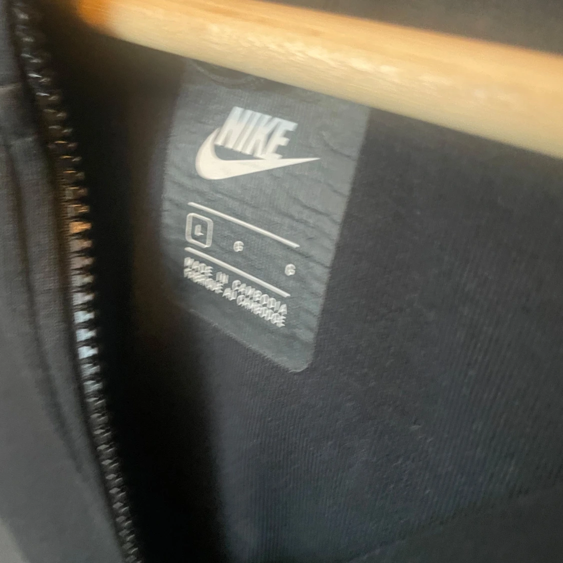 Säljer en svart hoodie från Nike med dragkedja och huva. Jackan har en diskret logga på bröstet och en blank rand över bröstet. Perfekt för dig som gillar sportig stil och vill ha något bekvämt till vardagen.