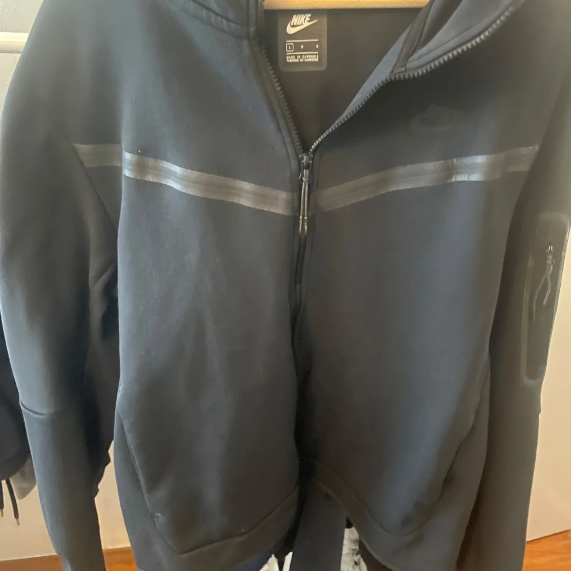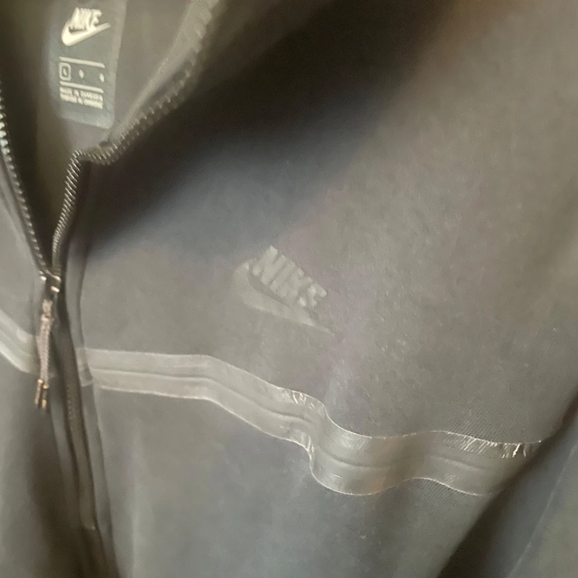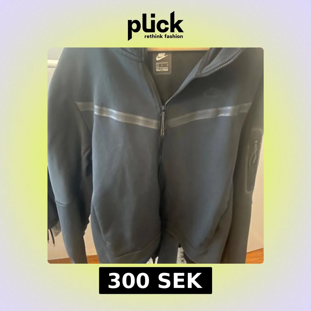 Säljer en svart hoodie från Nike med dragkedja och huva. Jackan har en diskret logga på bröstet och en blank rand över bröstet. Perfekt för dig som gillar sportig stil och vill ha något bekvämt till vardagen.
