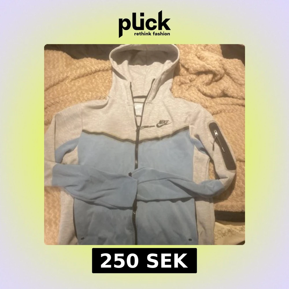 Säljer en snygg Nike hoodie med dragkedja. Jackan är grå upptill och ljusblå nedtill, har huva och en svart Nike-logga på bröstet. Det finns även en ficka med dragkedja på ena ärmen. Perfekt för en sportig stil.