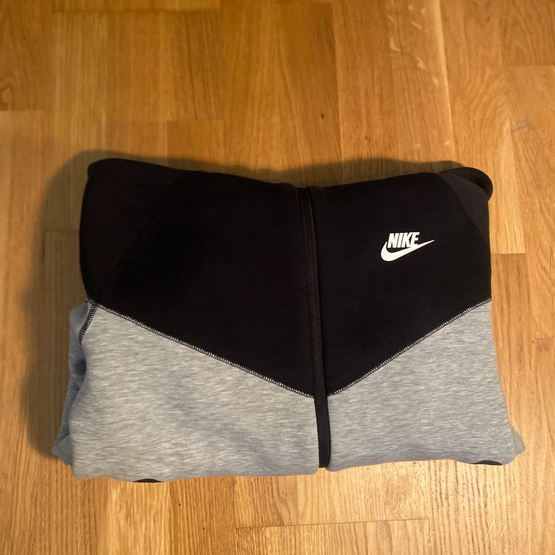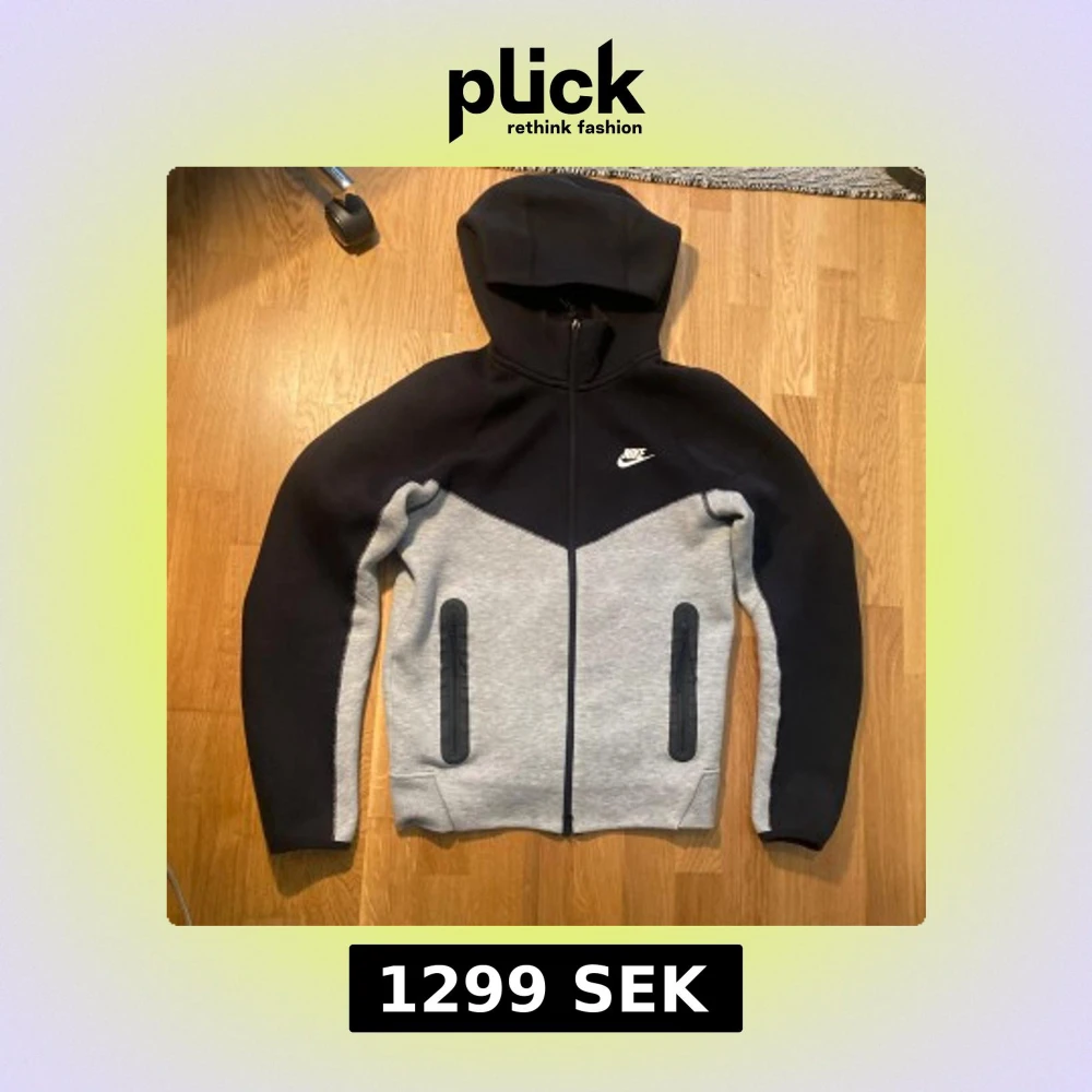Säljer en snygg grå och svart hoodie från Nike med dragkedja och huva. Den har långa ärmar och två praktiska fickor framtill. Perfekt för en sportig look eller avslappnade dagar.
