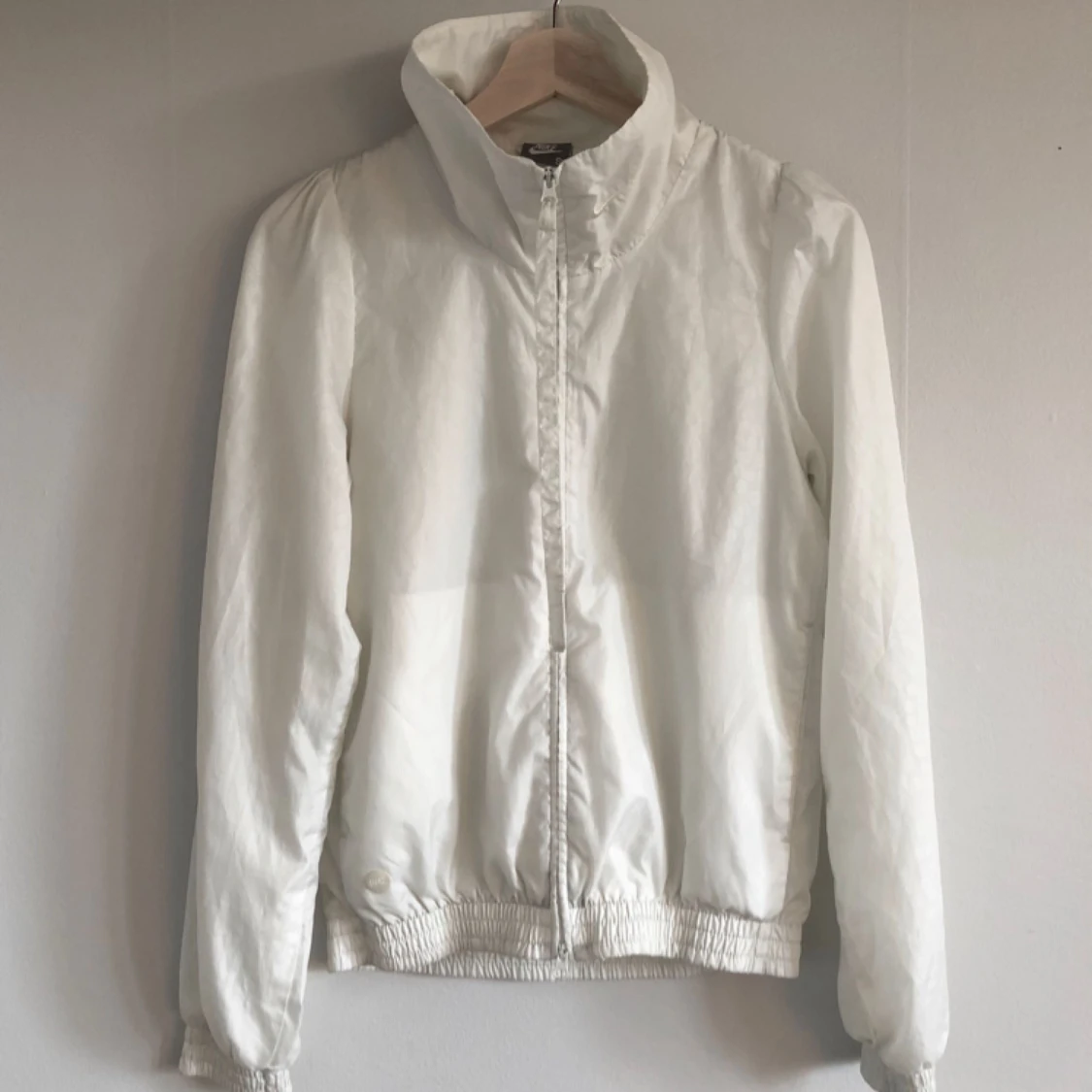 Vit Nike vindjacka. Fina feminina detaljer, lätt veckade axlar och nätt modell. Två sidfickor. Dubbel kläpp på dragkedja. Endast en minimal fläck på ena ärmen, se sista bilden. Köparen betalar frakt, 45 kr.