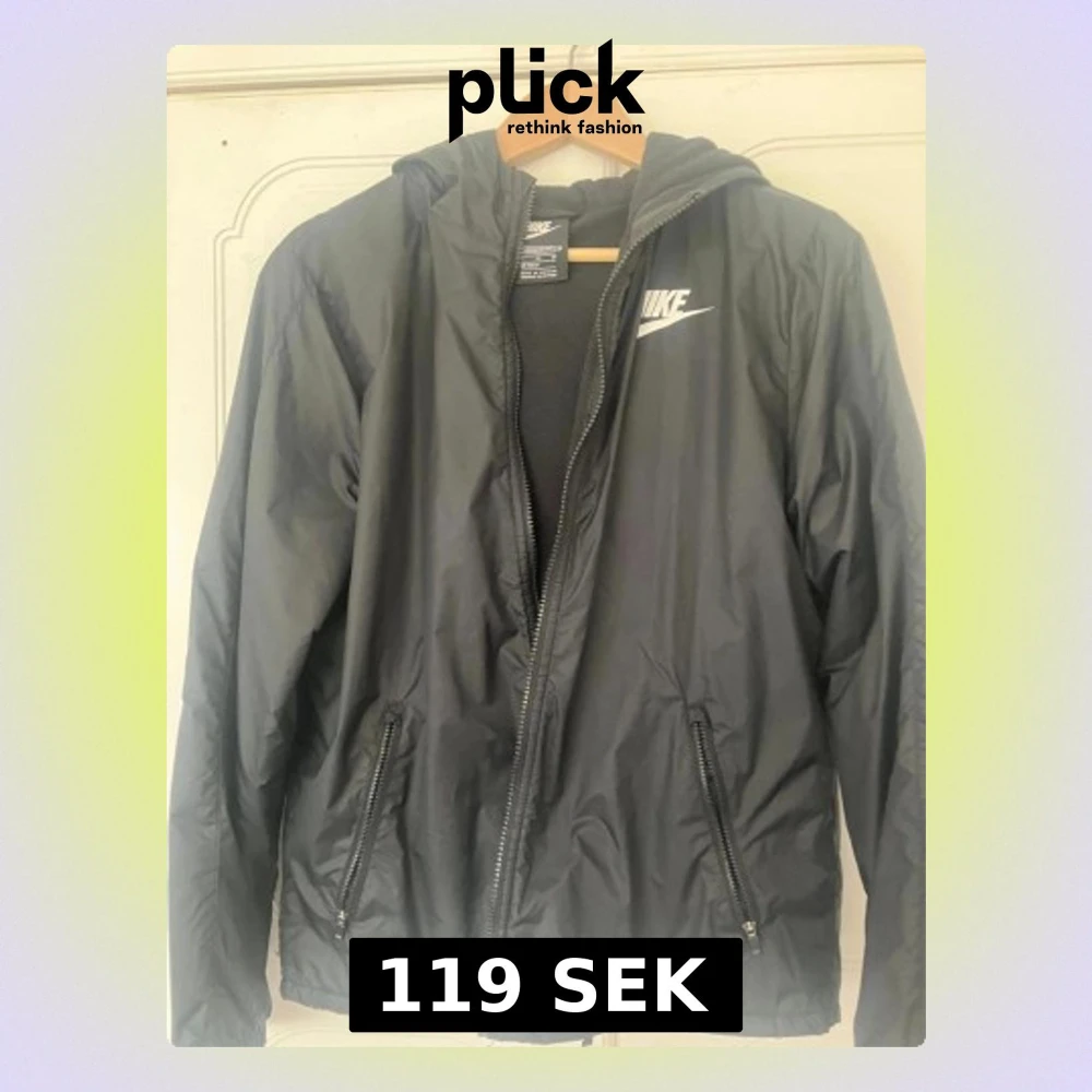 Svart vindjacka från Nike i storlek XL med huva och dragkedja. Jackan har två fickor med dragkedjor och vit Nike-logga på bröstet. Insidan är fodrad med mjuk fleece och har en 'Just Do It'-detalj. Perfekt för blåsiga dagar.