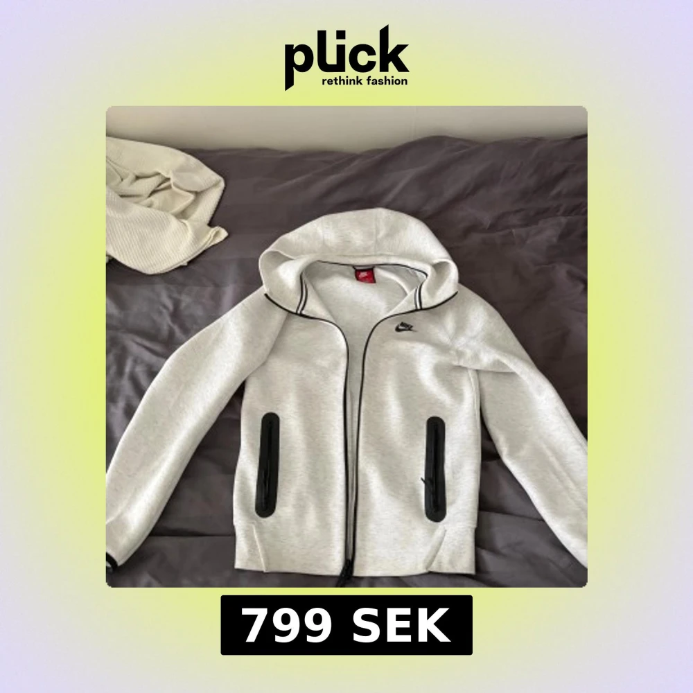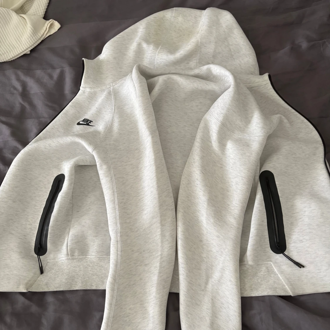 Nike hoodiejacka i vit med svarta detaljer och dragkedjor på fickorna. Jackan har huva, lång ärm och svart Nike-logga på bröstet. Materialet är mjukt och känns som syntet, perfekt för chill eller träning. Snygg kontrast med svarta kantband längs dragkedjan och huvan.