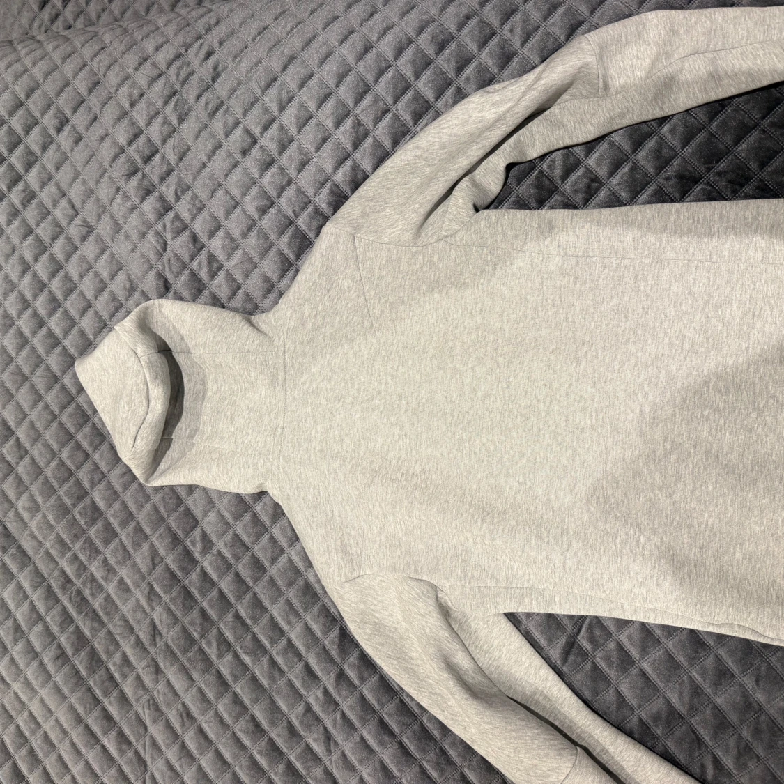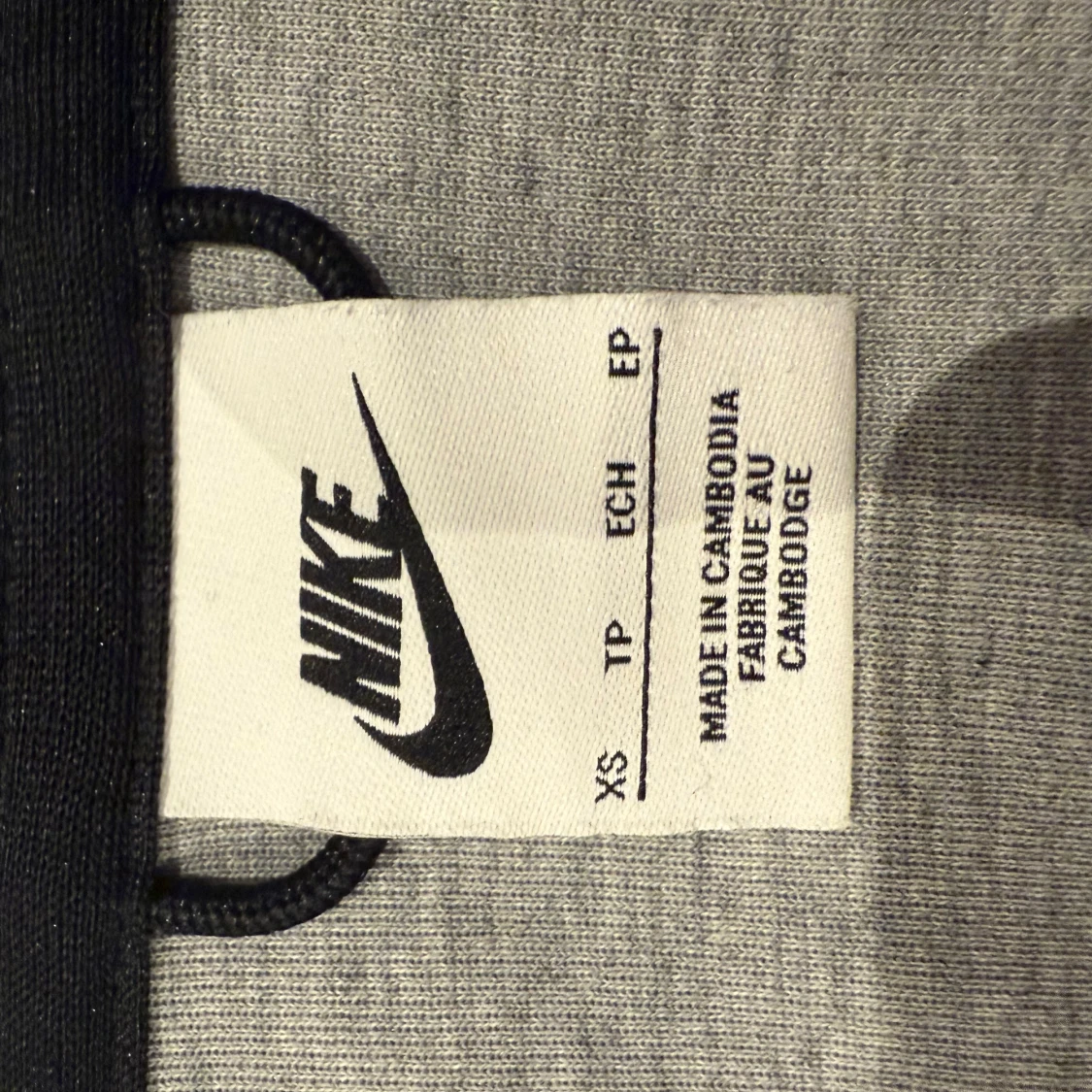 Snygg grå vindjacka från Nike i storlek XS. Jackan har hel dragkedja, huva och svarta detaljer längs bröstet och ärmen. Perfekt för dig som gillar sportig stil och vill ha något lätt och bekvämt. Klassisk Nike-logga på bröstet. OBS den har en liten fläck.