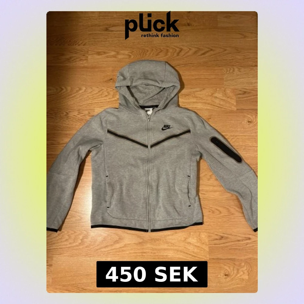 Grå zip-hoodie från Nike med svart logga på bröstet, hel dragkedja och huva. Jackan har svarta detaljer längs bröstet och en praktisk ficka med dragkedja på ena ärmen. Tillverkad i mjuk bomullsblandning, perfekt för chill eller träning.