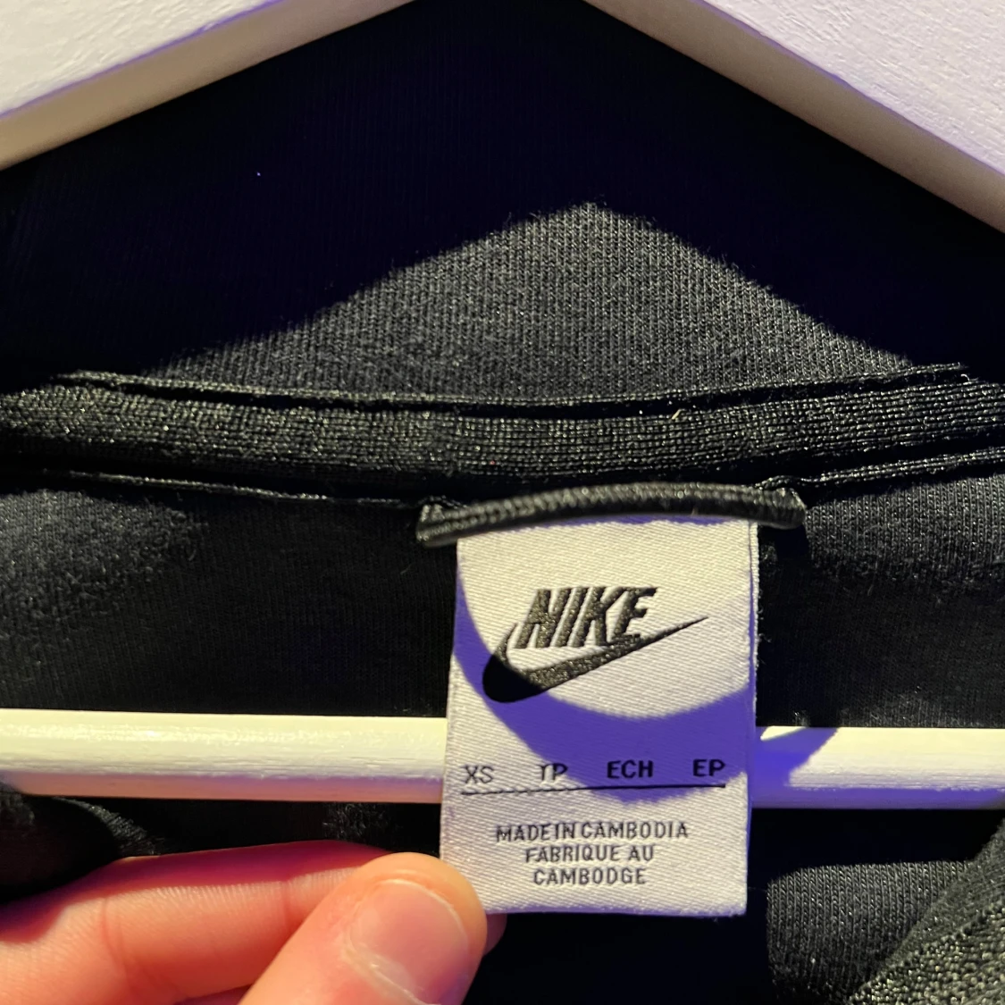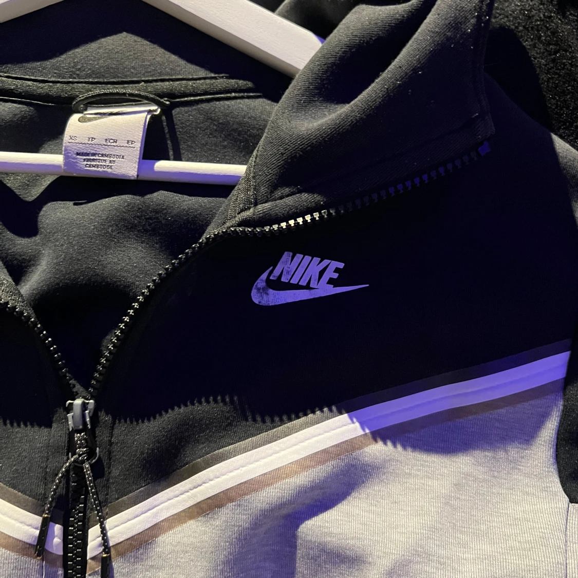 Storlek xs men passar även s. Snygg ziphoodie från Nike i svart och ljusgrått med vit logga på bröstet. Jackan har huva, dragkedja och två fickor framtill. Perfekt för en sportig och avslappnad stil.