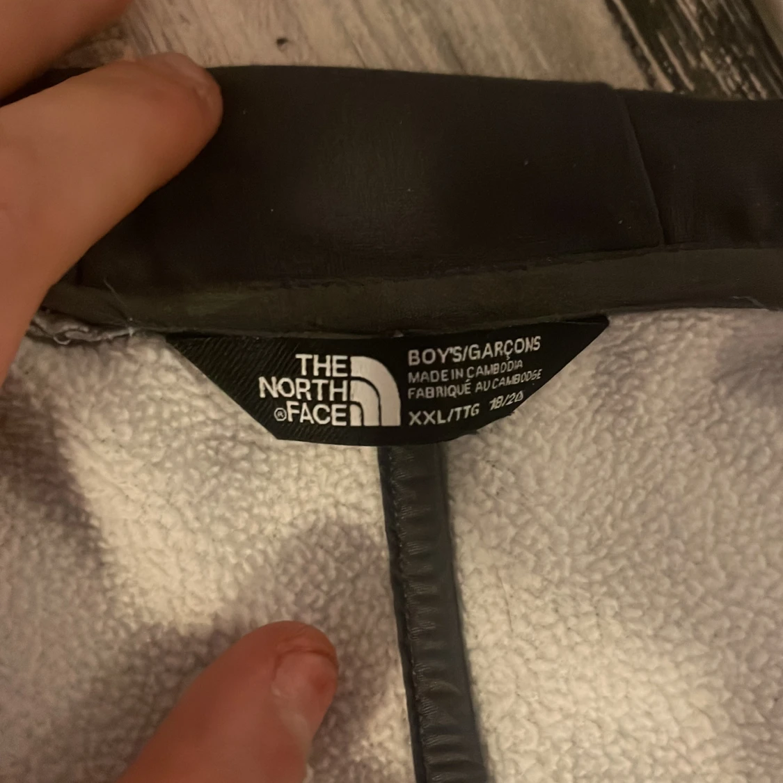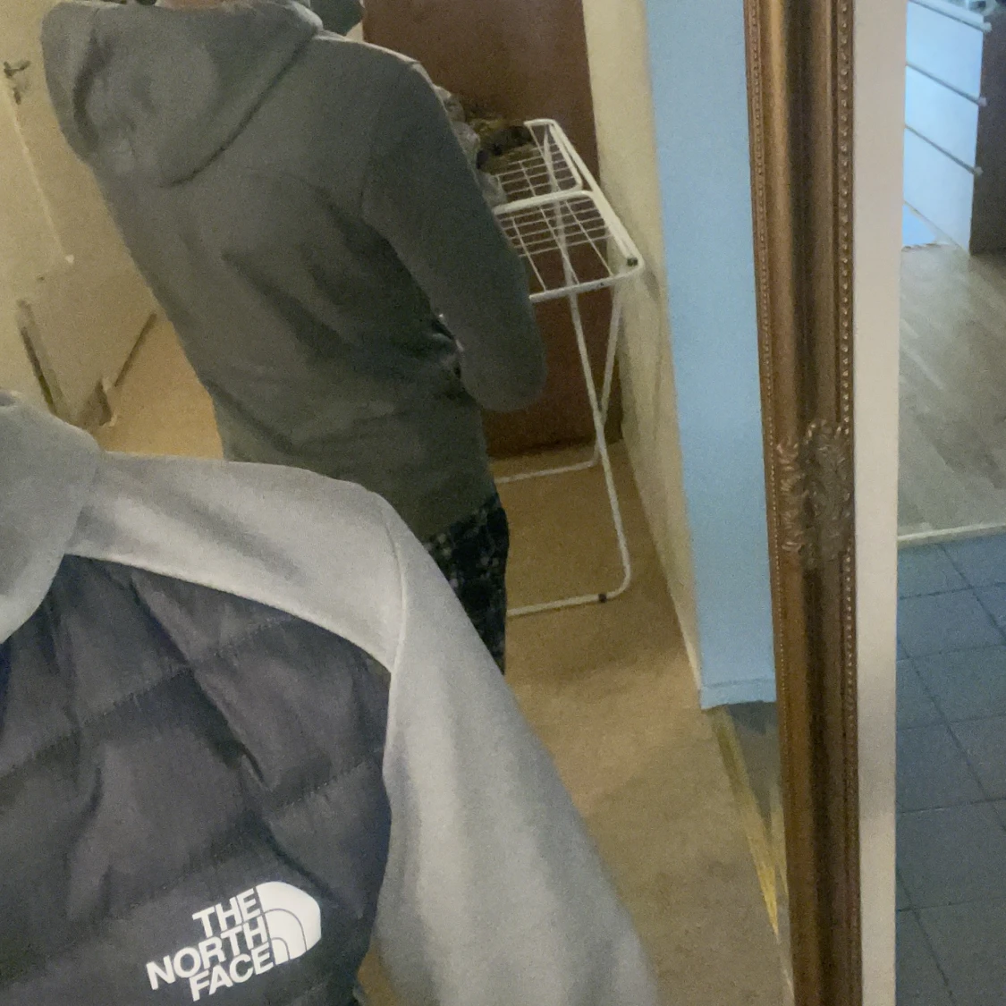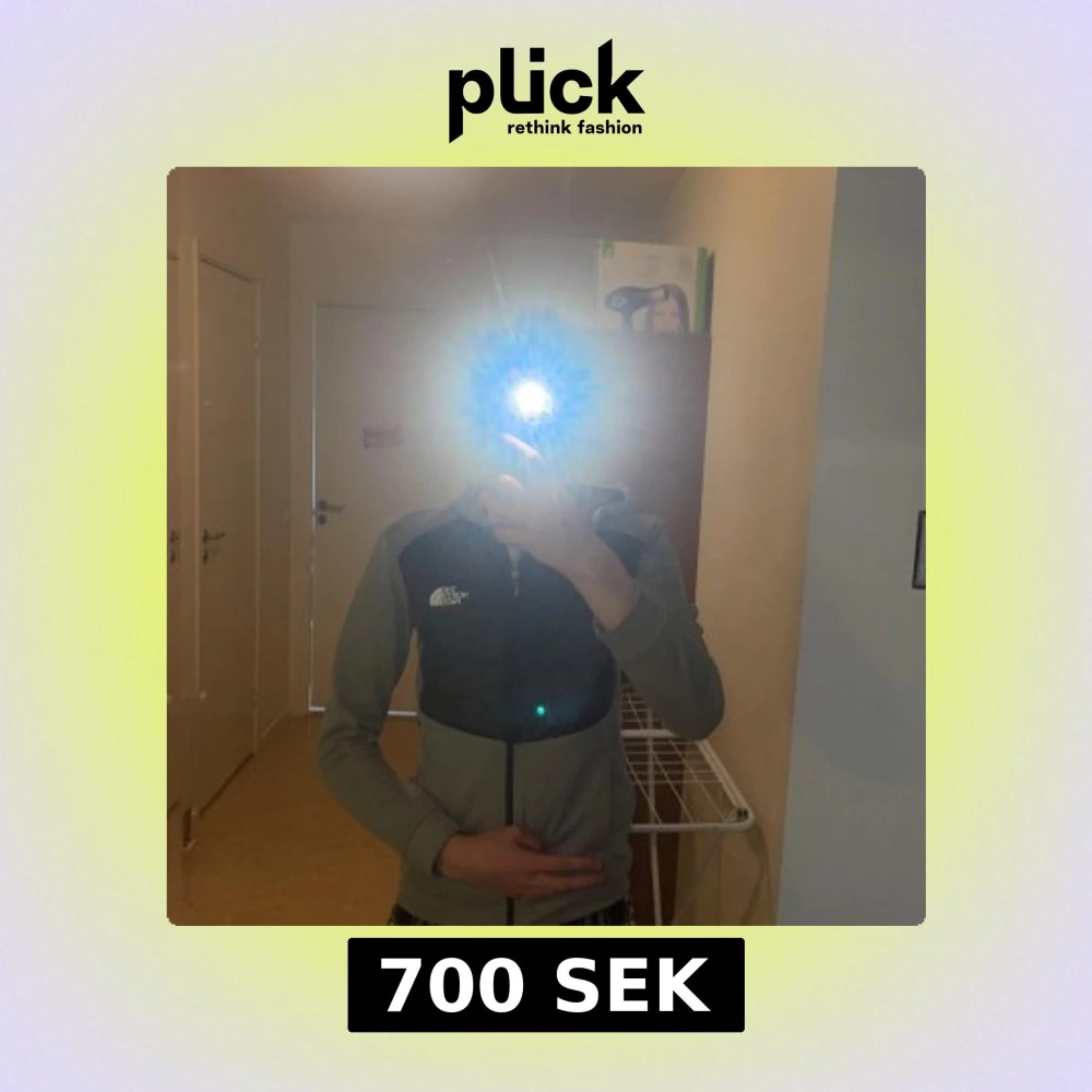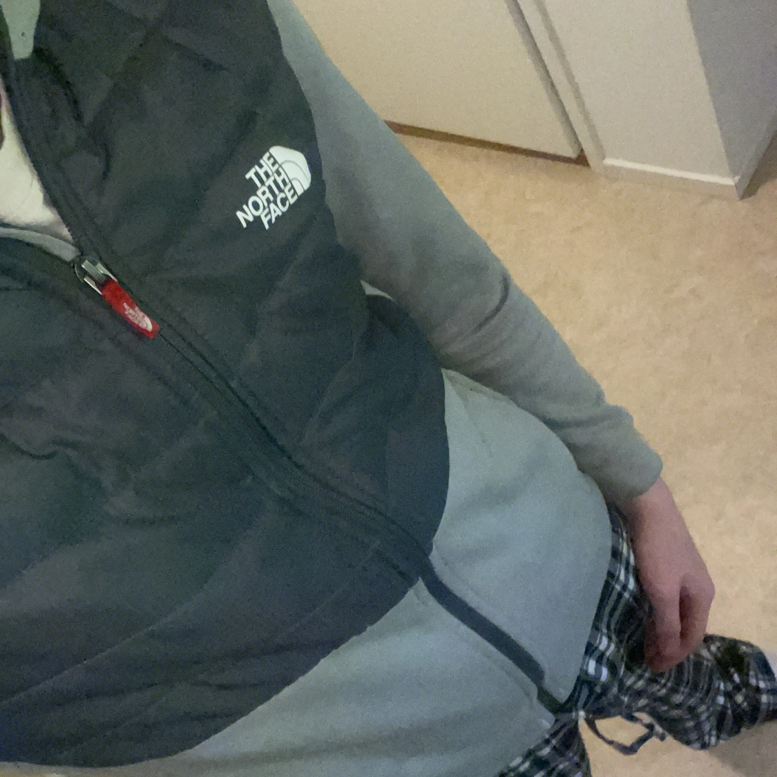 Säljer en grå och svart cardigan från The North Face med dragkedja framtill. Den har lång ärm och en sportig look, perfekt för dig som gillar streetwear. Loggan syns tydligt på bröstet och jackan har en bekväm passform.