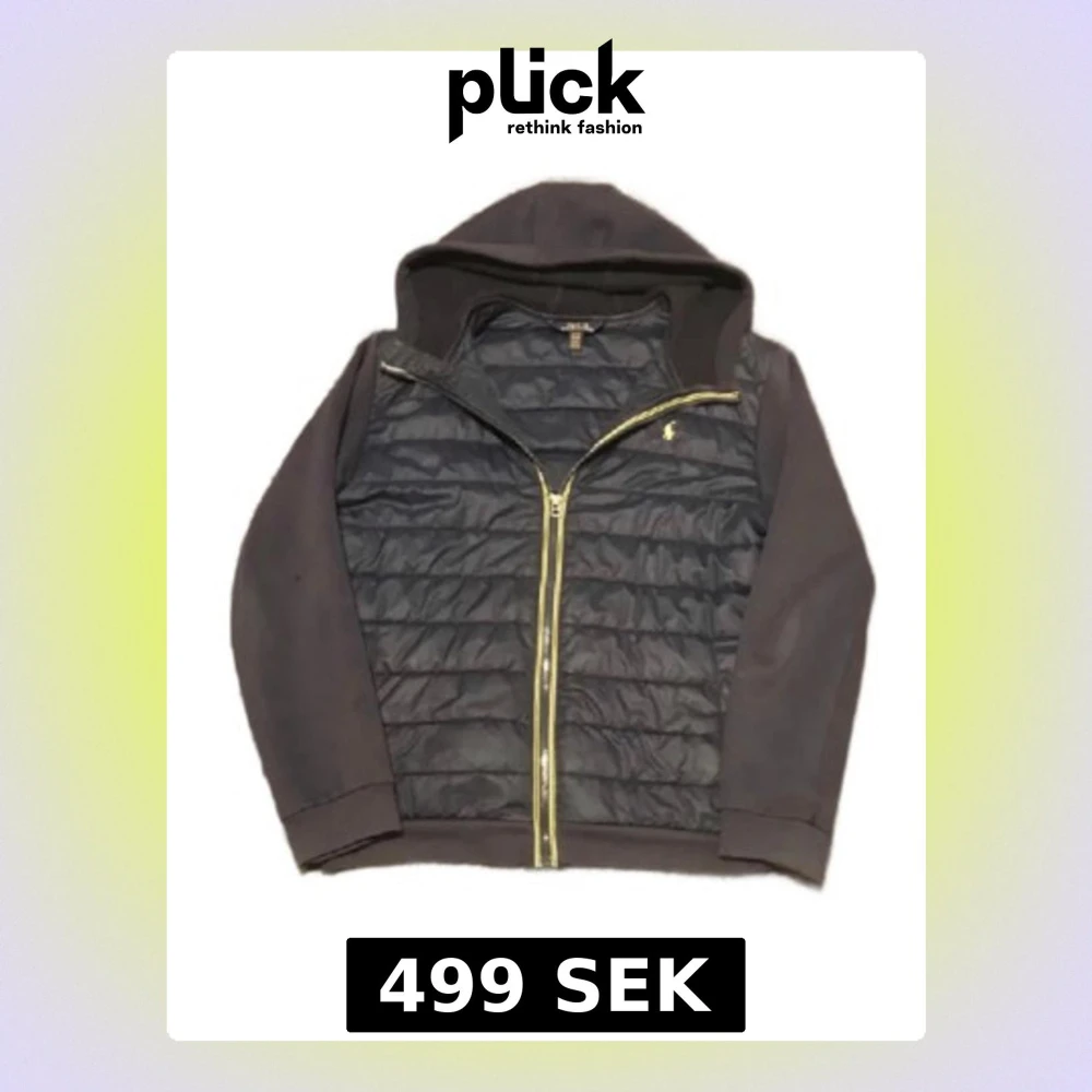 Säljer en blå hybridjacka från Polo Ralph Lauren med quiltad front och ärmar i sweatshirtmaterial. Jackan har huva, dragkedja i gult och den klassiska loggan på bröstet. Perfekt för lager-på-lager under höst och vår. Grabben på bilden är 169cm och 54kg storlek XS/S🤩