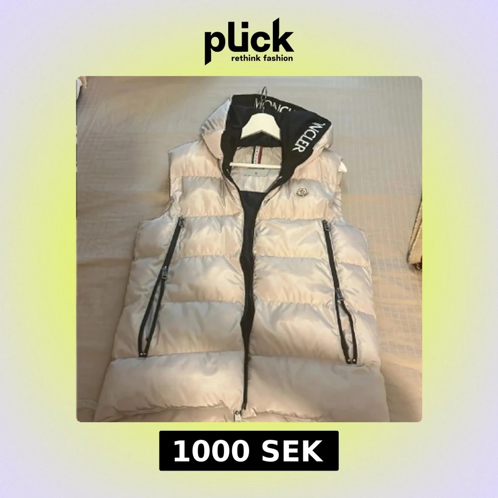 Snygg beige/grå dunväst från Moncler med svart huva och dragkedja framtill. Helt ny! Strl s passar både dam och herr.