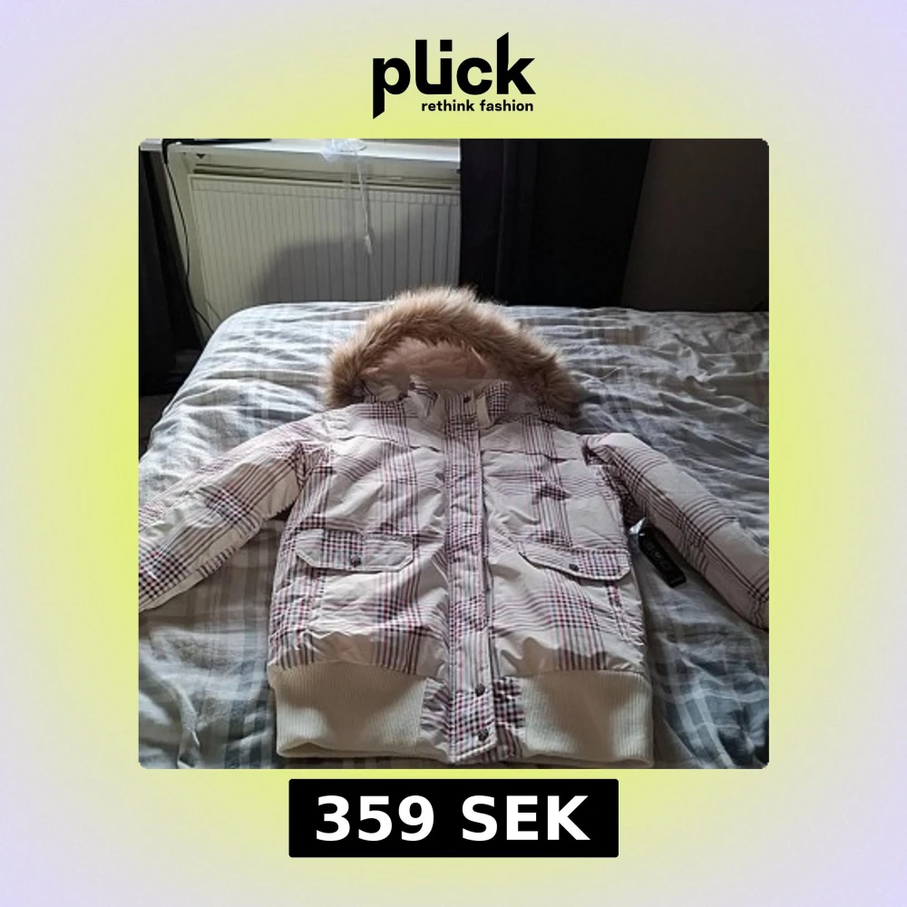 Säljer en rutig vinterjacka med avtagbar pälskrage. Jackan har en dragkedja och knappar framtill samt praktiska fickor med lock. Jackan är ny med prislapp kvar.