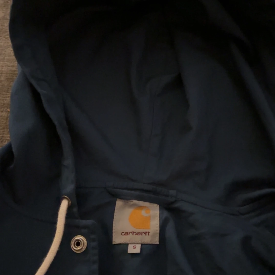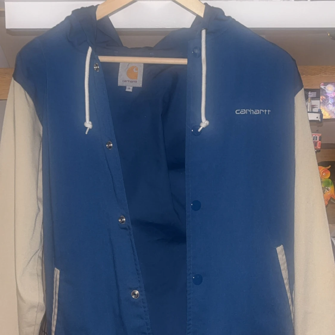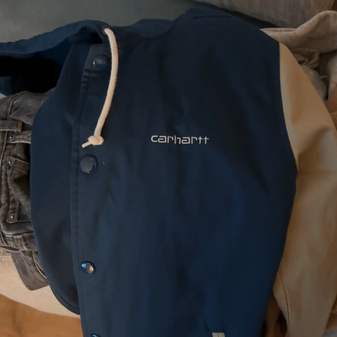 Snygg bomberjacka från Carhartt i blått med beige ärmar och vit snörning i huvan. Jackan är aldirg använd endast testad.