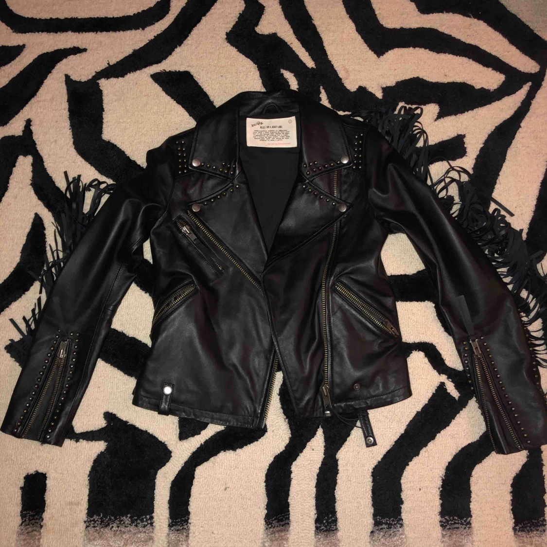 Äkta skinnjacka från Odd Molly med fransar på ärmar och rygg i storlek 0 motsvarande XS. Inköpt för 1 år sedan för 7000 kr