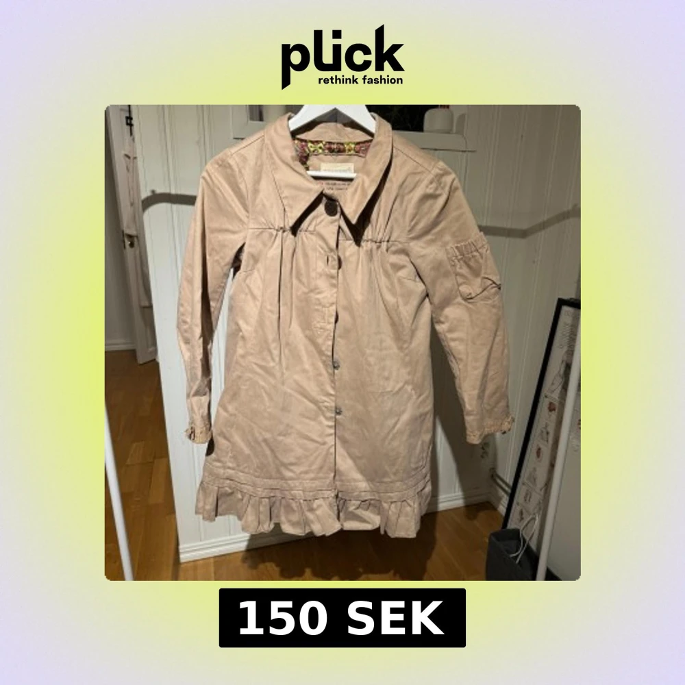 Säljer en beige kappa från Odd Molly med volangdetaljer vid nederkanten och knappar framtill. Jackan har långa ärmar och en unik design med en färgglad insida. Perfekt för att ge din outfit en stilfull touch.