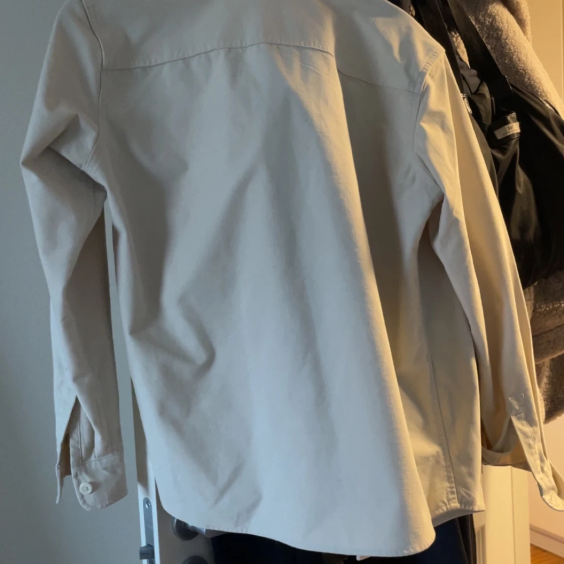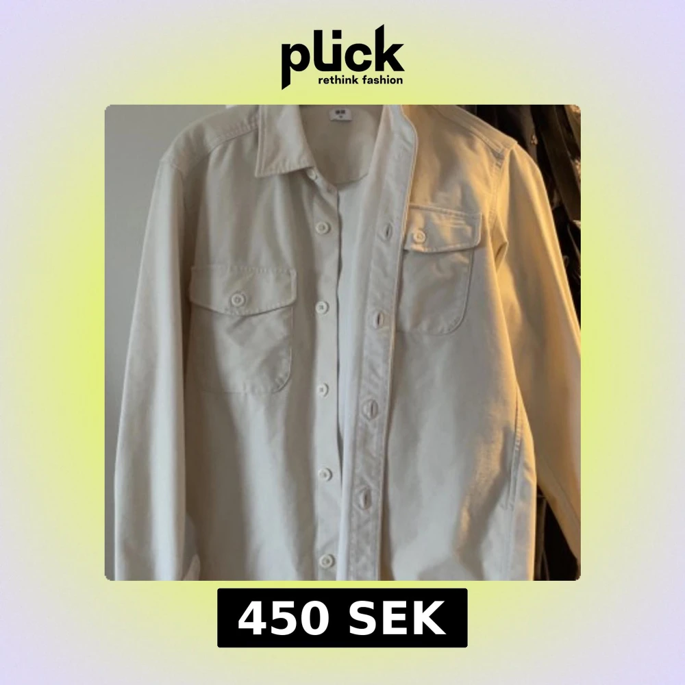 Stilren off white overshirt från Uniqlo med klassisk krage, två bröstfickor med lock och knappar framtill. Skjortan är långärmad och tillverkad i mjuk bomull, perfekt att bära öppen eller stängd för en avslappnad look. Xs men sitter mer som en S