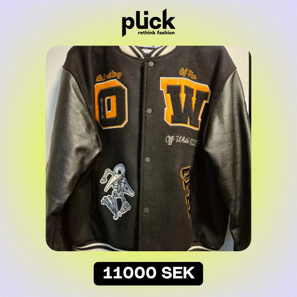 Säljer en snygg varsity jacka från Off-White med coola orangea detaljer och broderier. Jackan har långa ärmar i skinn och knappar framtill. Condition 9.5 av 10