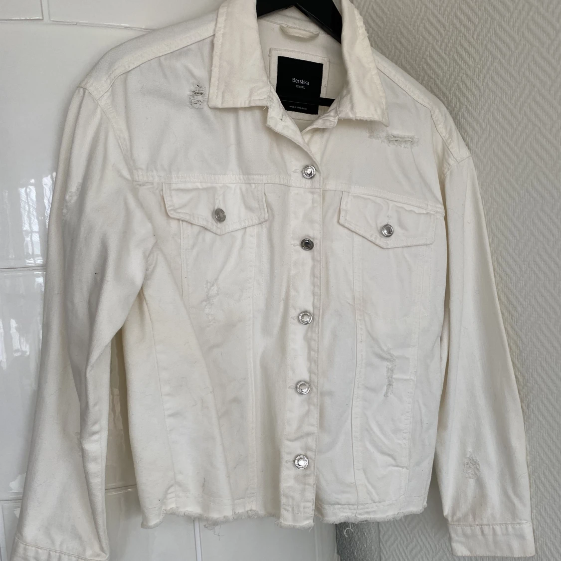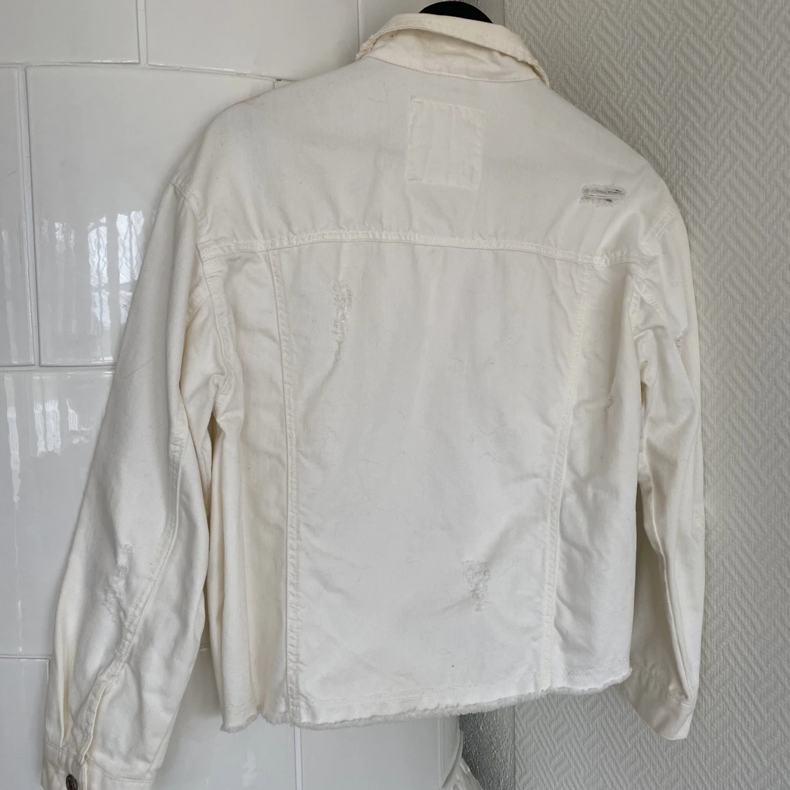 Offwhite jeansjacka från Bershka, storlek S. Silvriga knappar och slitningar på vissa ställen 🤍