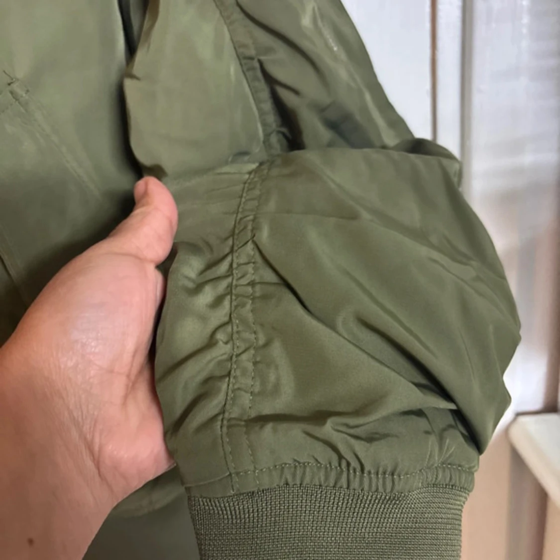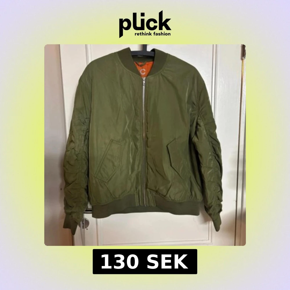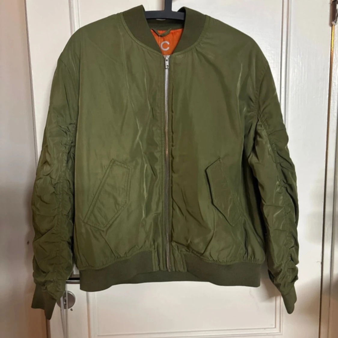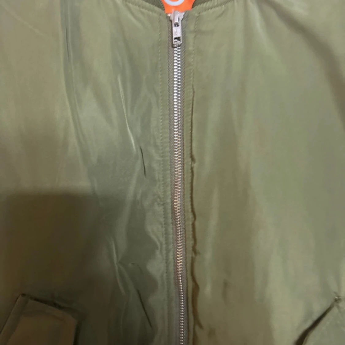 Säljer en olivgrön bomberjacka med klassisk passform och ribbade muddar. Jackan har två snedställda fickor framtill och stängs med en silvrig dragkedja. Insidan är orange för en snygg kontrast. Perfekt för dig som gillar streetstyle.