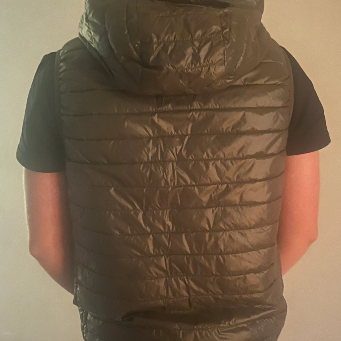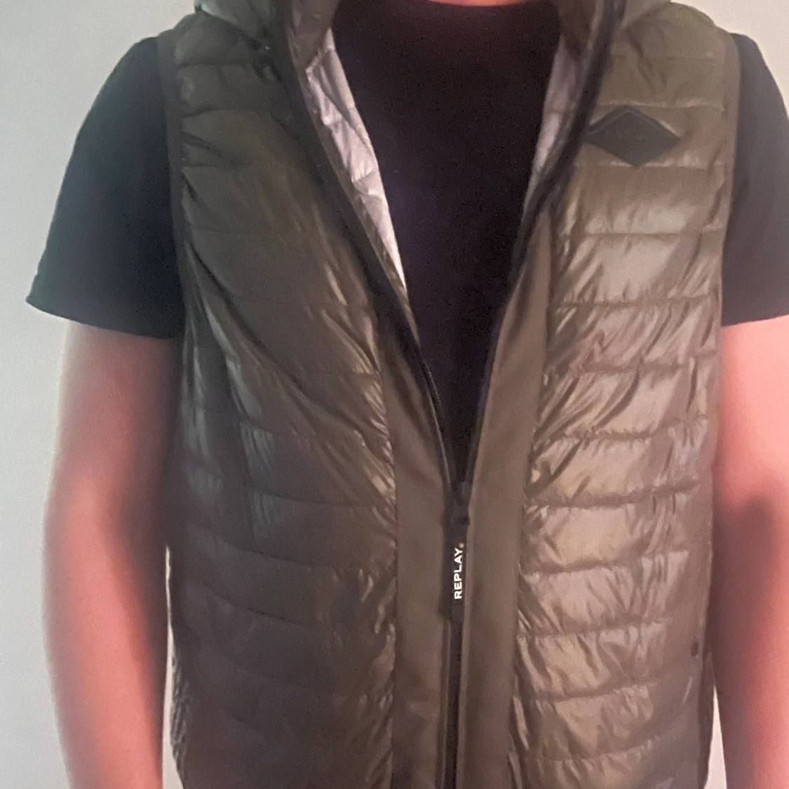 Snygg olivgrön dunväst från Replay med huva och quiltad design. Västen har dragkedja framtill med Replay-logga och ett Replay-märke på bröstet. Perfekt att slänga över en hoodie för extra värme under hösten eller vintern. Storlek M.