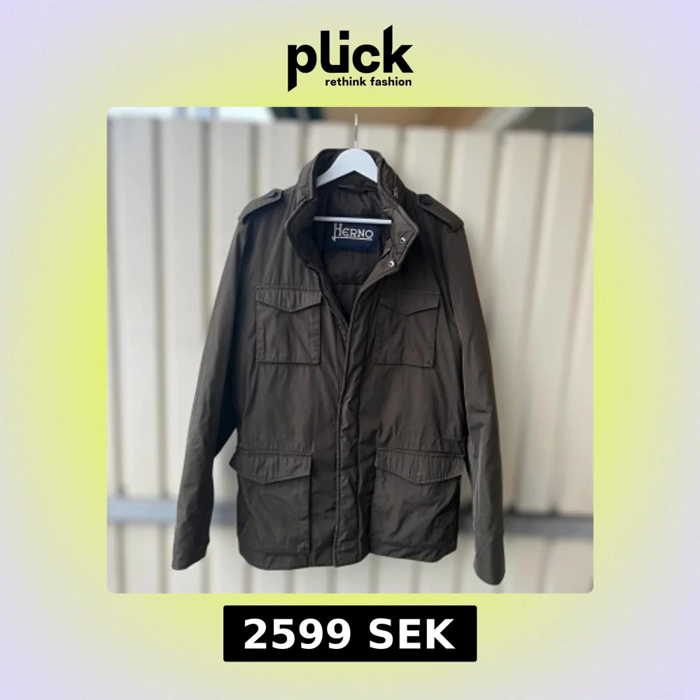 Snygg olivgrön parkajacka från Herno med fyra stora fickor framtill, axelklaffar och hög krage. Jackan har dragkedja och tryckknappar, perfekt för dig som gillar stilren och funktionell design. Storlek 54 men sitter mindre än så, mer som en 50 vilket motsvarar en M/L