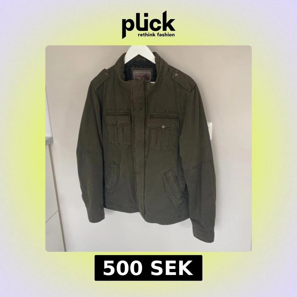 Säljer en olivgrön jacka från Levi's i storlek M. Jackan har fyra fickor framtill med lock och tryckknappar, axelklaffar och dragkedja. Materialet är bomull och fodret är i mjuk fleece. (Herrmodell)