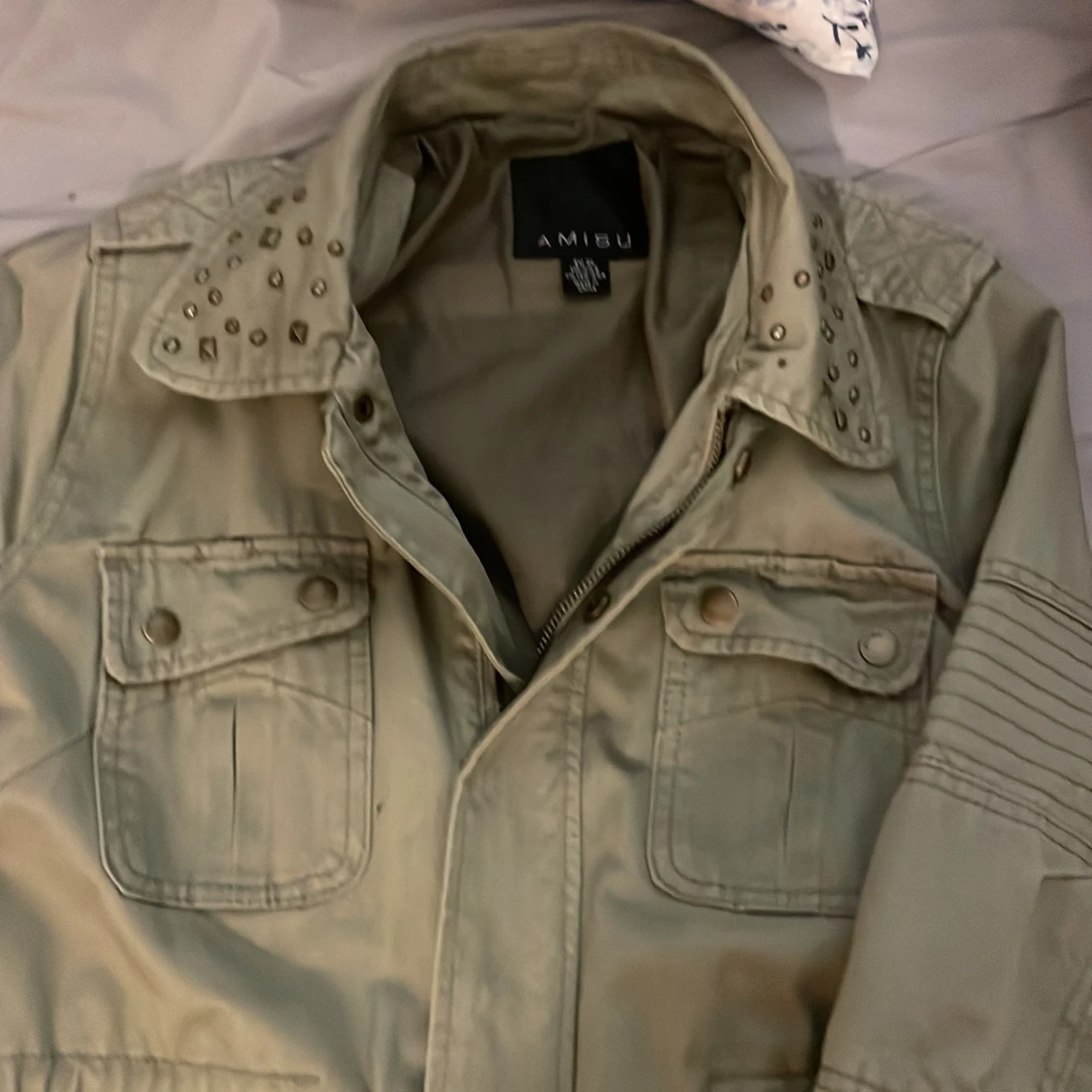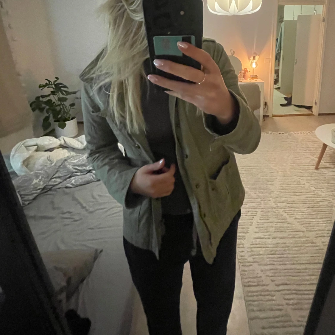 Säljer en snygg olivgrön jacka. Den har coola nitar på kragen och praktiska fickor framtill. Perfekt för höst och vår! Jackan har en dragkedja och knappar för extra stil och funktionalitet. Passar perfekt för en casual look. Står storlek s men skulle säga ett den är s/xs