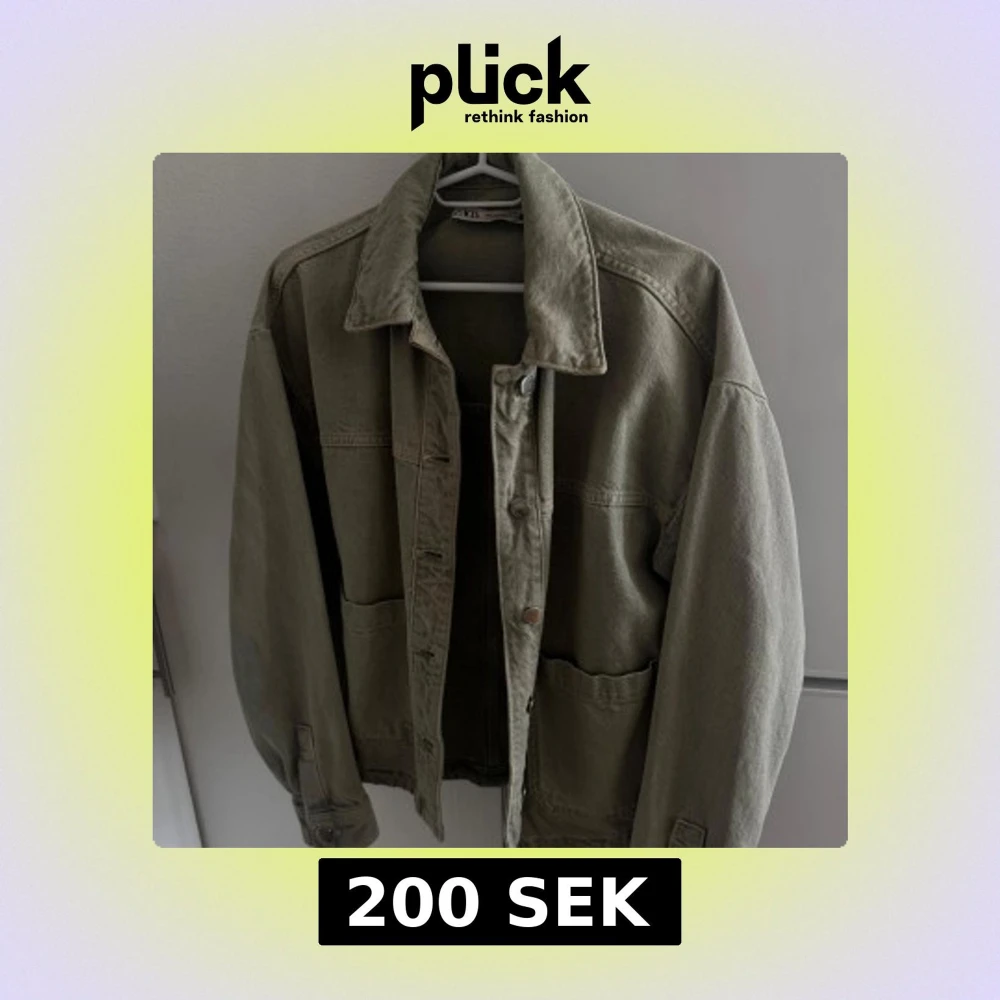 Khakigrön jeansjacka från Zara med klassisk krage, stora fickor framtill och knäppning med silvriga knappar. Jackan har en loose passform och långa ärmar med knapp vid ärmslut. Perfekt att slänga över en t-shirt för en chill look.
