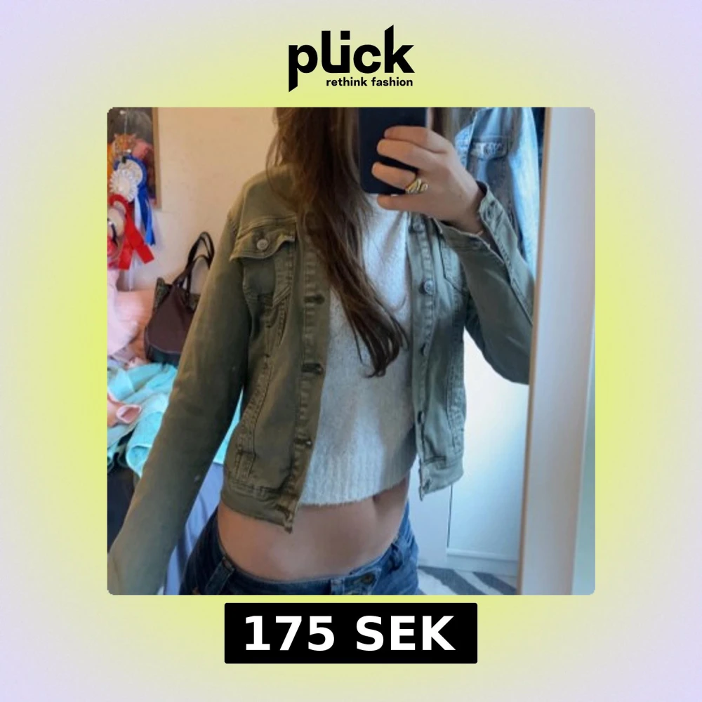 Snygg olivgrön jeansjacka med klassisk krage, bröstfickor med lock och knappar framtill. Jackan har en croppad passform och långa ärmar.Säljer för den är för liten för mig