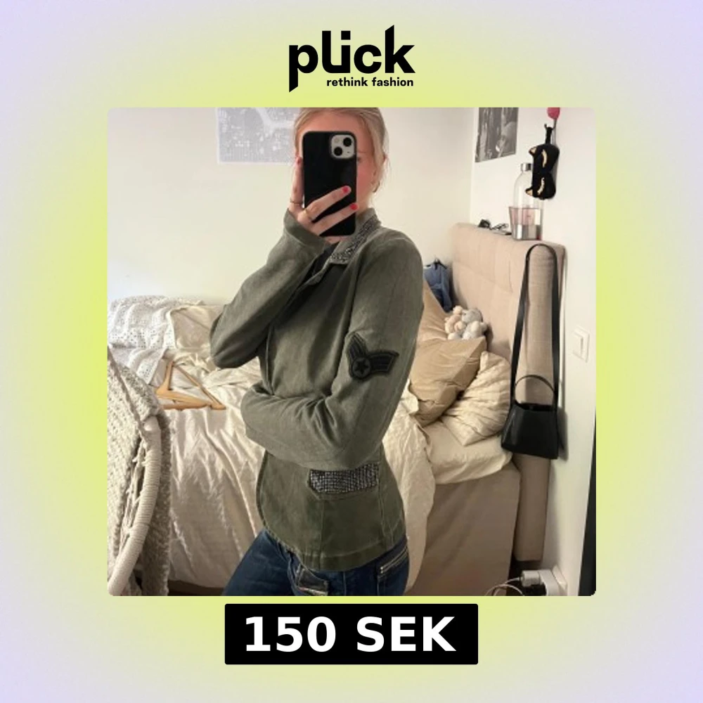 Säljer en olivgrön kavaj från Two Wings med snygga nitar på krage och fickor. Kavajen har två knappar framtill, lång ärm och dekorativ patch på ena ärmen. Perfekt för dig som vill sticka ut lite extra.
