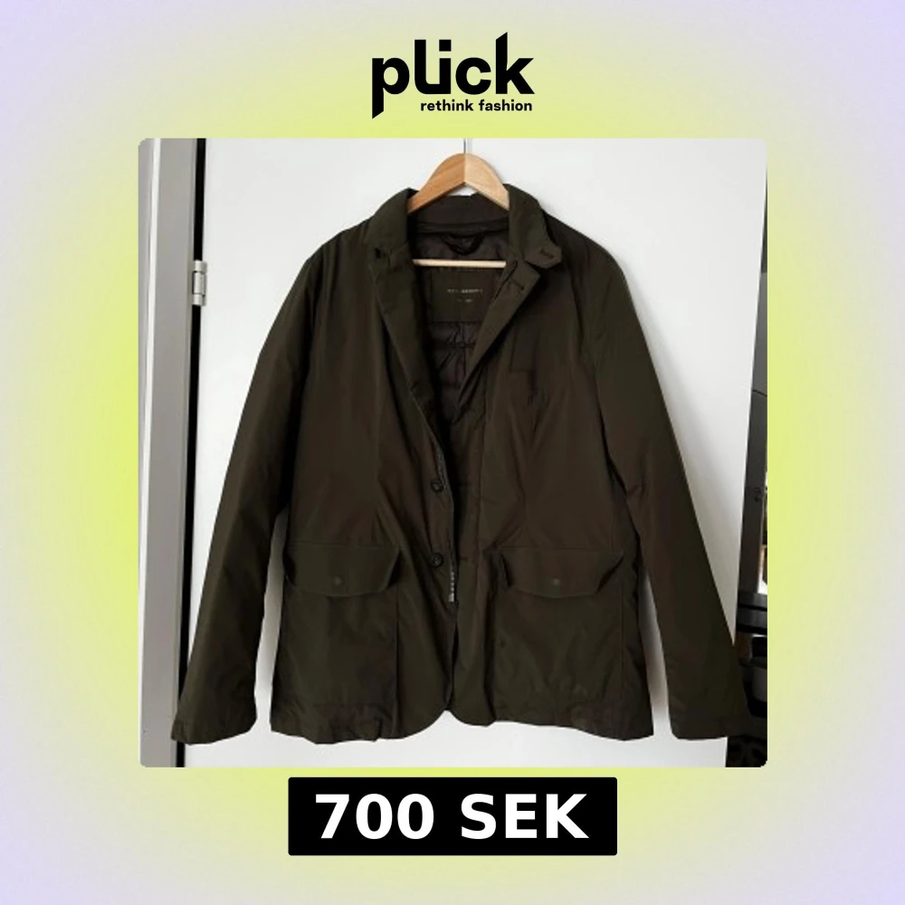 Säljer en olivgrön kavajjacka från Massimo Dutti med klassisk krage, knappar och två stora fickor framtill. Jackan har quiltat foder på insidan och är perfekt för kyligare dagar. Snygg och stilren design som passar till många tillfällen.