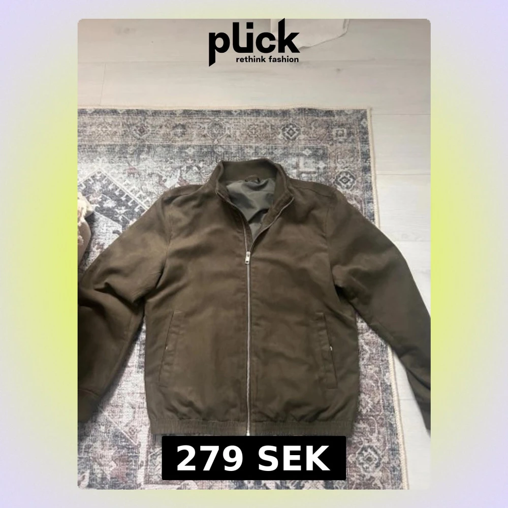 Snygg olivgrön jacka med rak passform och ståkrage. Jackan har dragkedja framtill, två sidofickor och elastisk nederkant. Materialet ser ut att vara bomull eller en bomullsblandning, perfekt för lager på lager under kallare dagar.