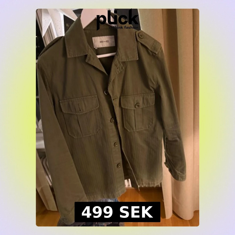 Snygg olivgrön overshirt från Whyred med klassisk krage, axelklaffar och två stora bröstfickor med knappar. Jackan har raka linjer och knäppning framtill, perfekt för lager-på-lager. Materialet är bomull och modellen är långärmad.