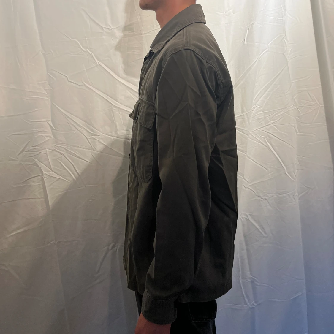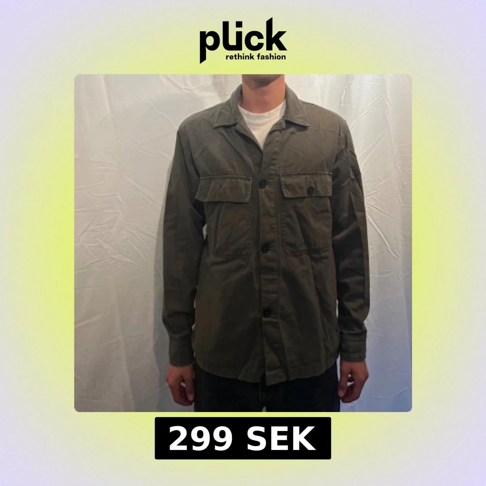 Stilren olivgrön overshirt med klassisk krage och stora bröstfickor med knappar. Jackan har raka linjer, knäppning framtill och är tillverkad i ett slitstarkt bomullstyg. Perfekt till hösten för lager-på-lager-plagg för en avslappnad look. Overshirten är från lager 157 och är i storlek S. Modellen är 180cm