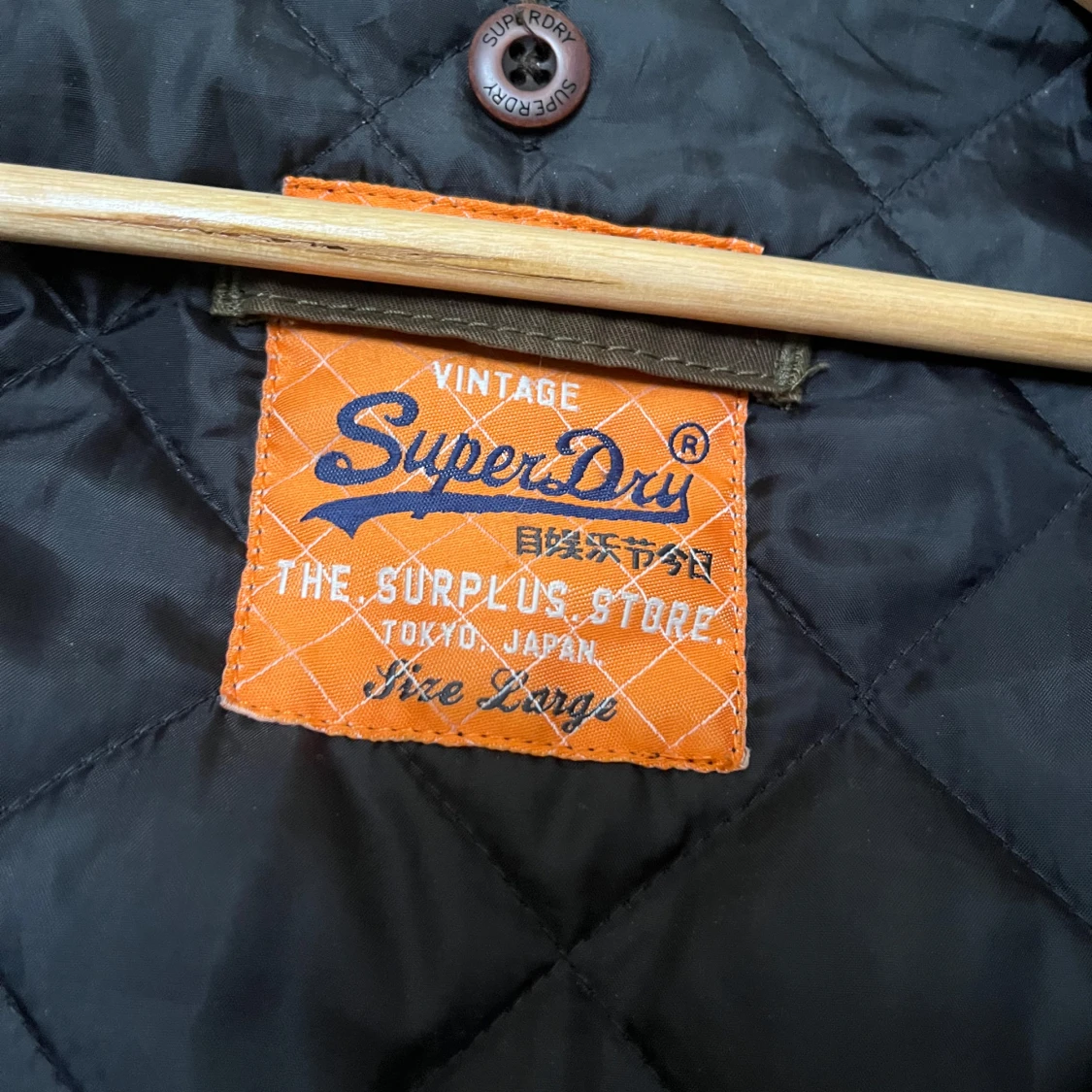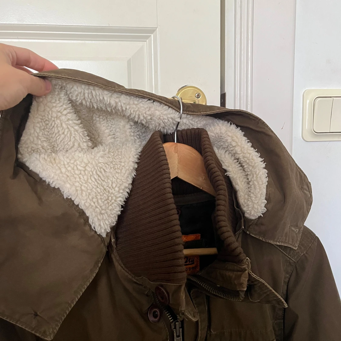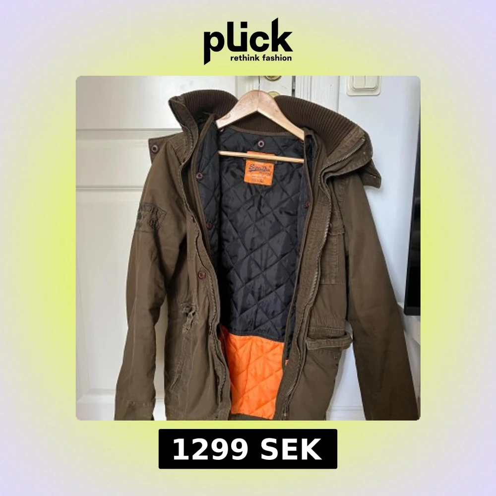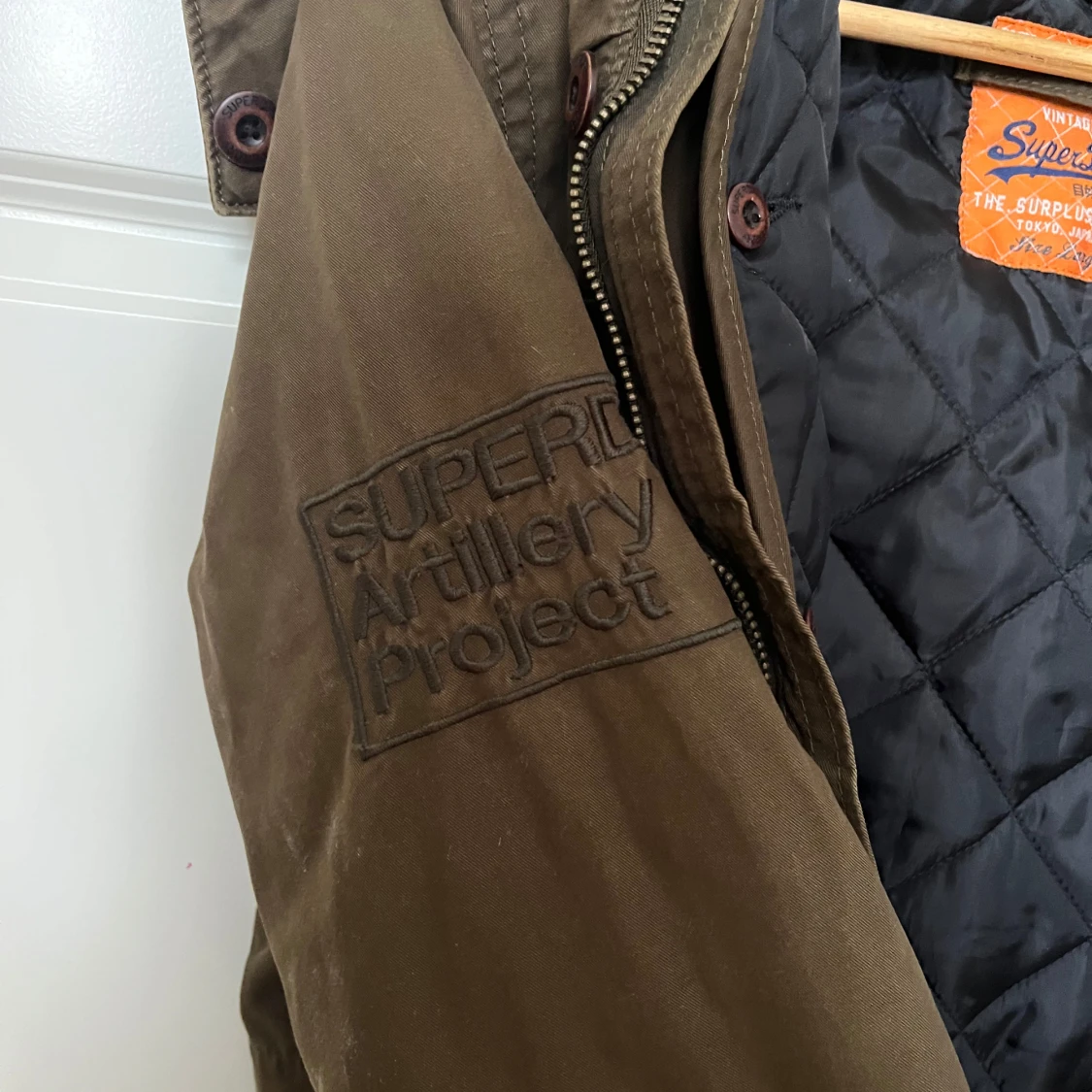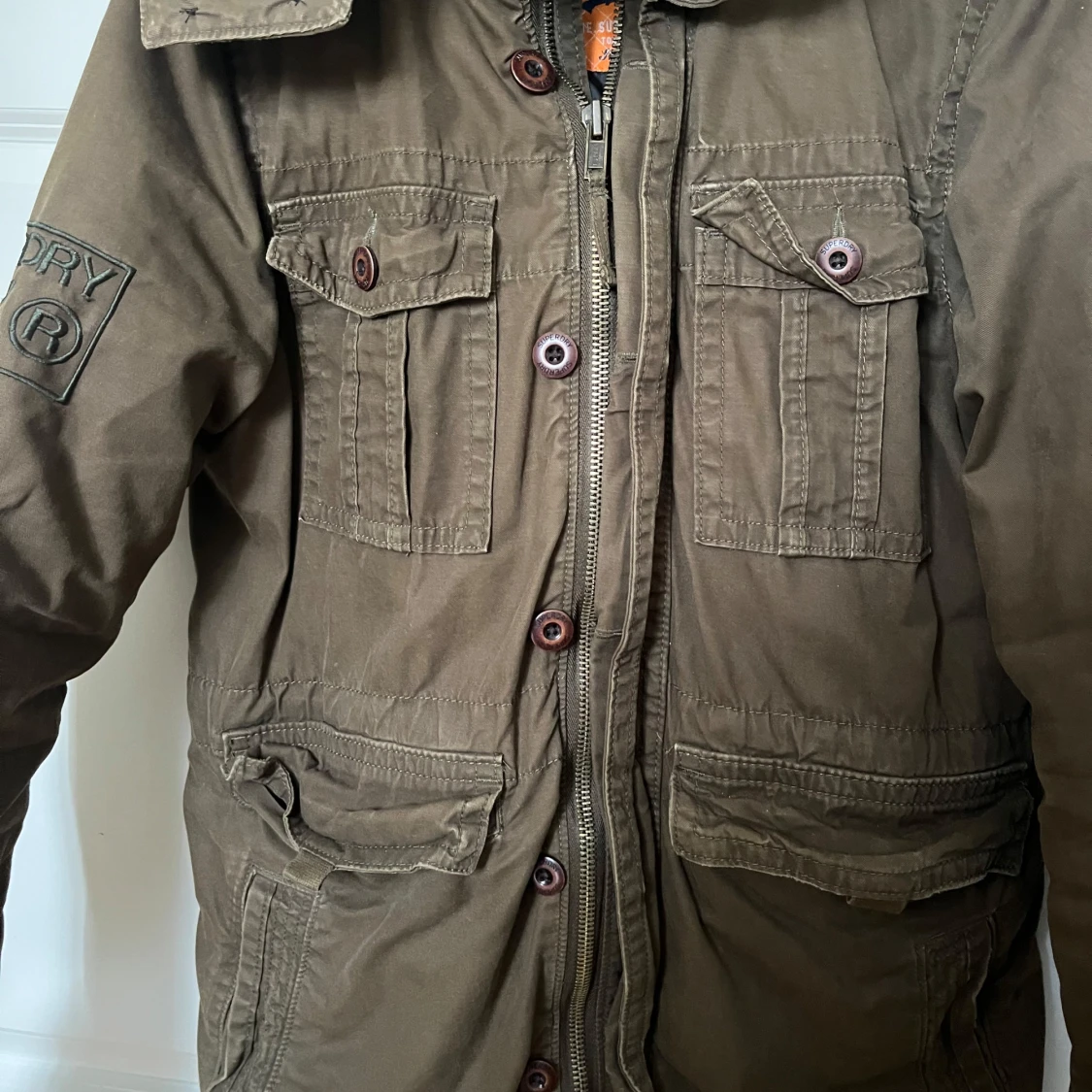 Säljer en olivgrön parkajacka från Superdry med broderad logga på ärmen, flera fickor framtill och quiltat foder i svart och orange. Jackan har både dragkedja och knappar, samt en hög krage och huva. Perfekt för kalla dagar och riktigt snygg streetstil. Hittar inte vart storleken står men skulle säga att det är M-L