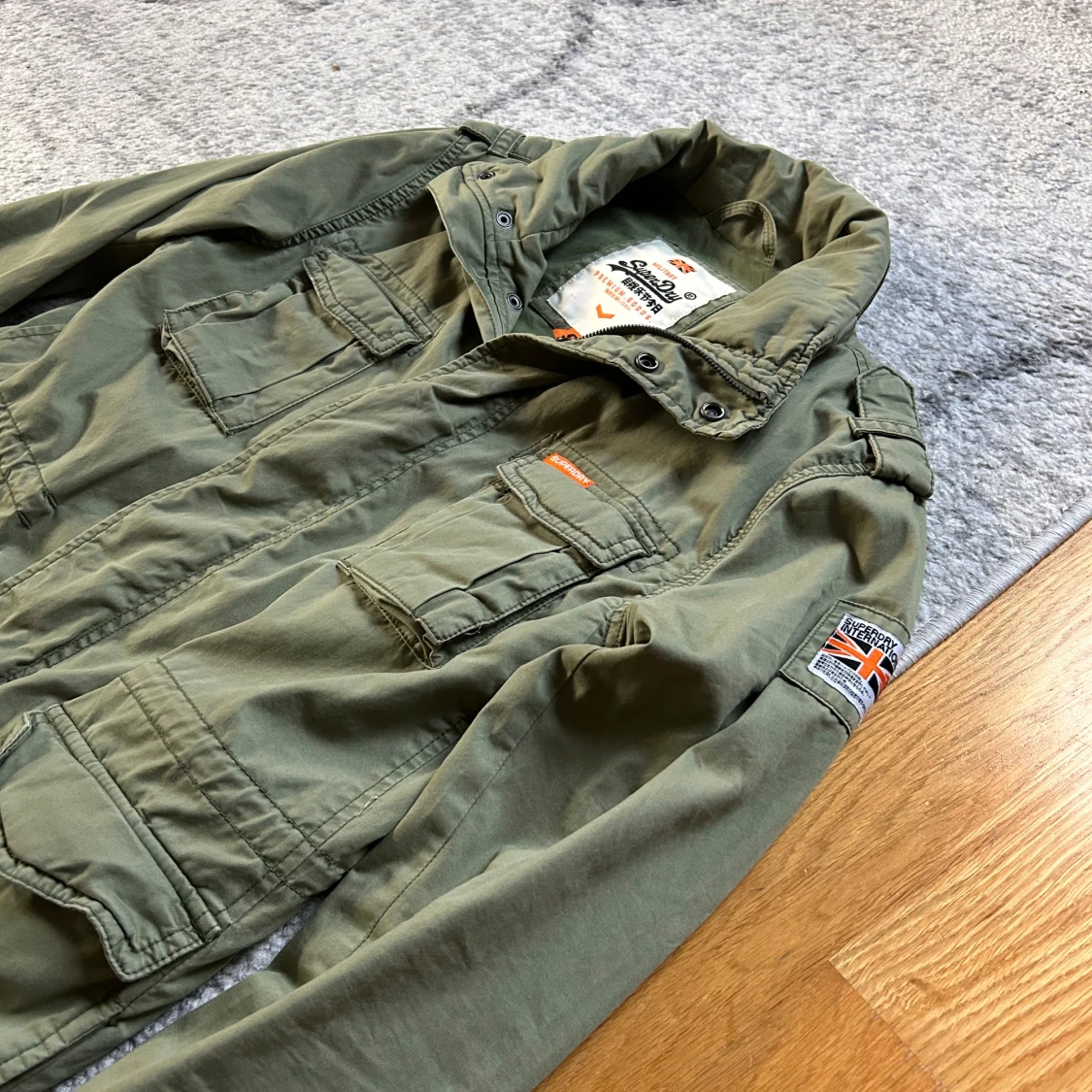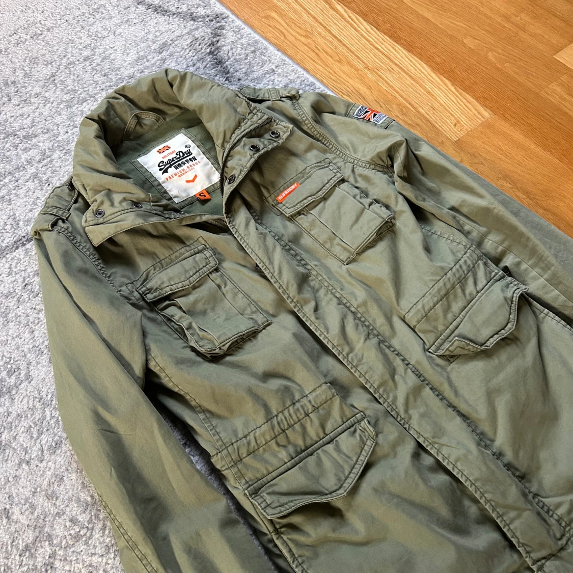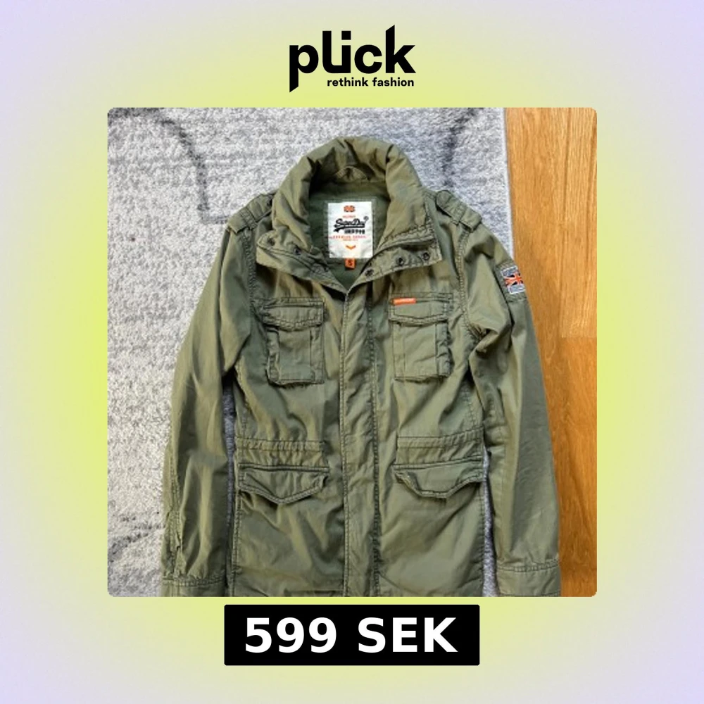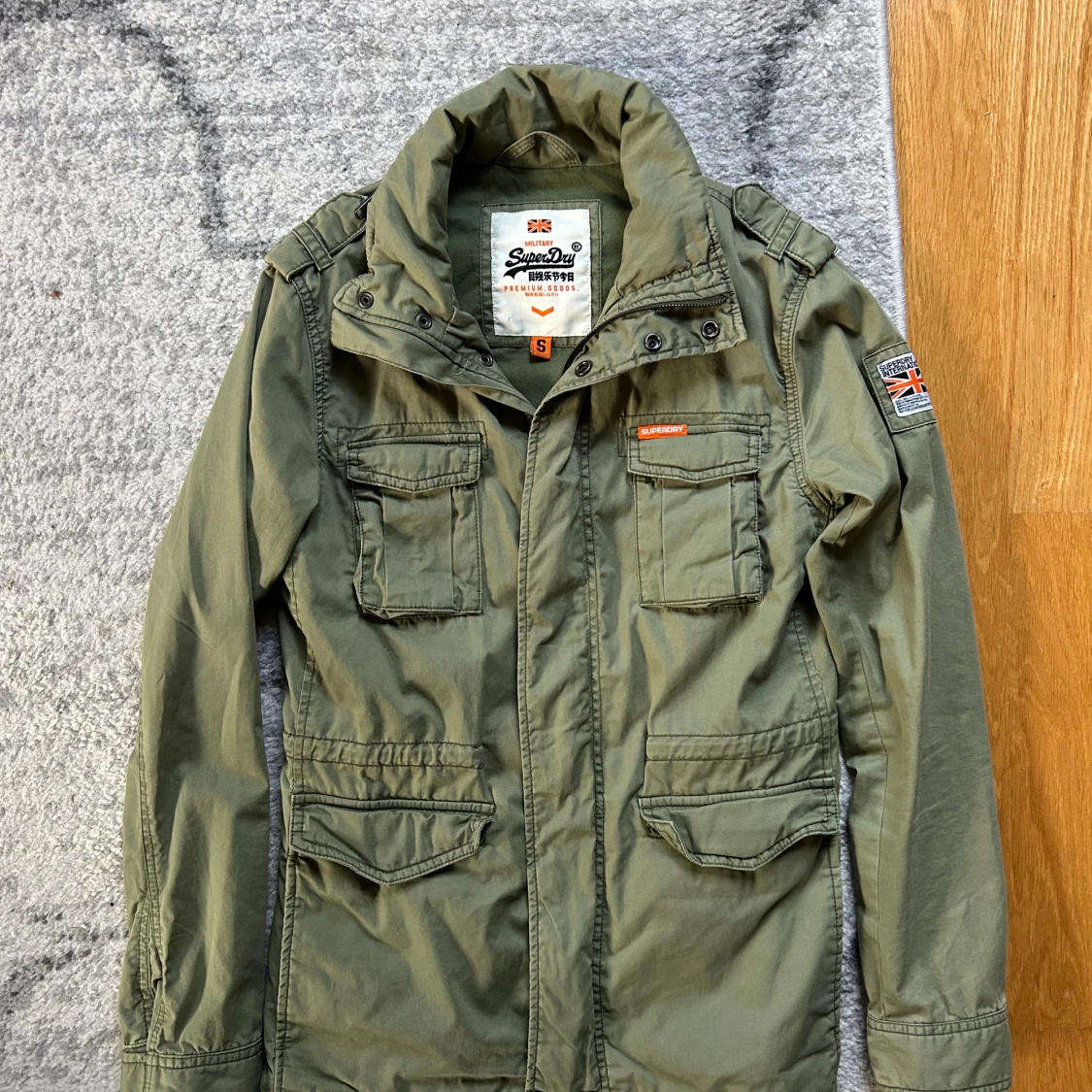 Säljer en olivgrön parkajacka från Superdry med fyra stora fickor framtill, hög krage och patch med brittisk flagga på ärmen. Jackan har coola detaljer som axelklaffar och tryckknappar. Perfekt för dig som gillar streetstyle och funktionella plagg.
