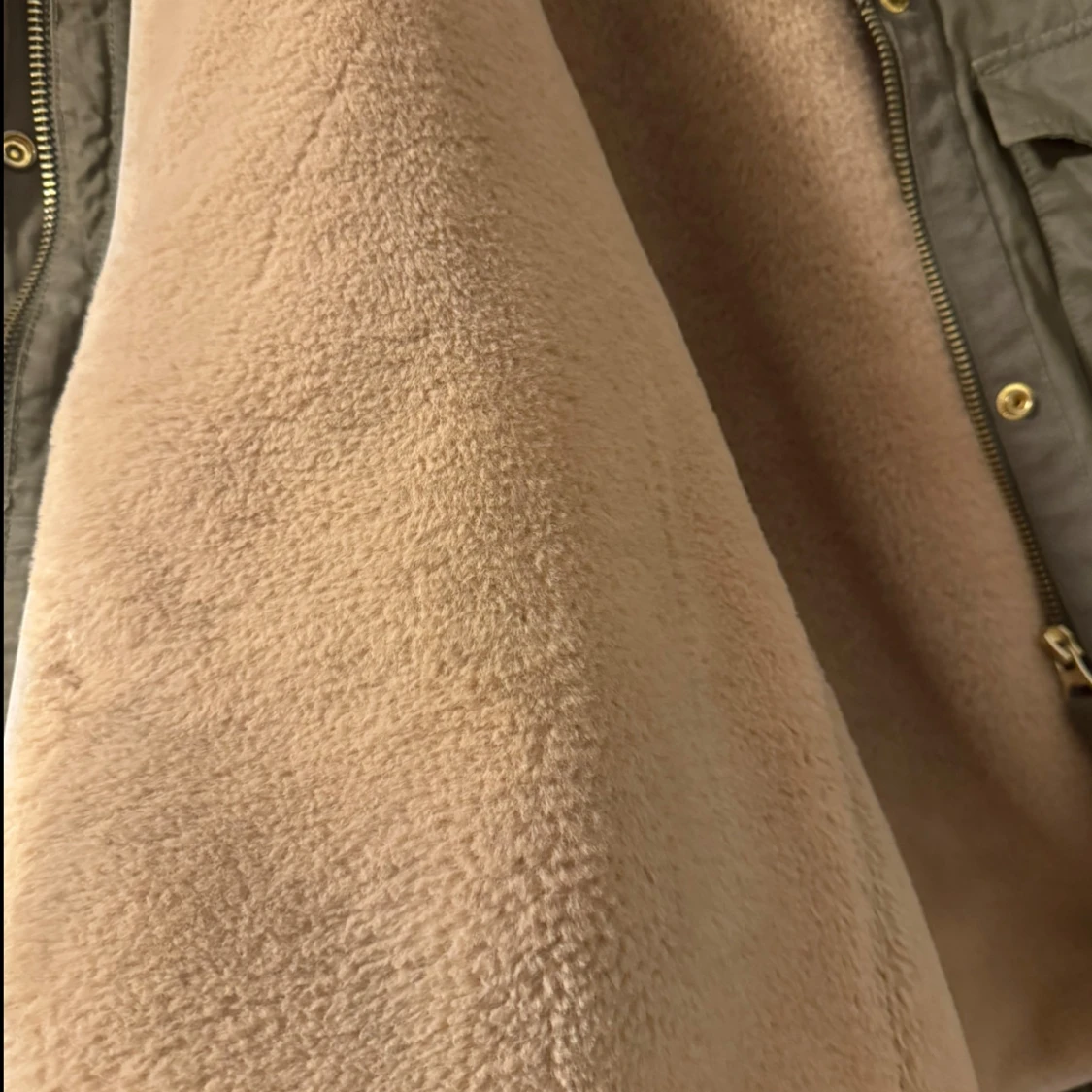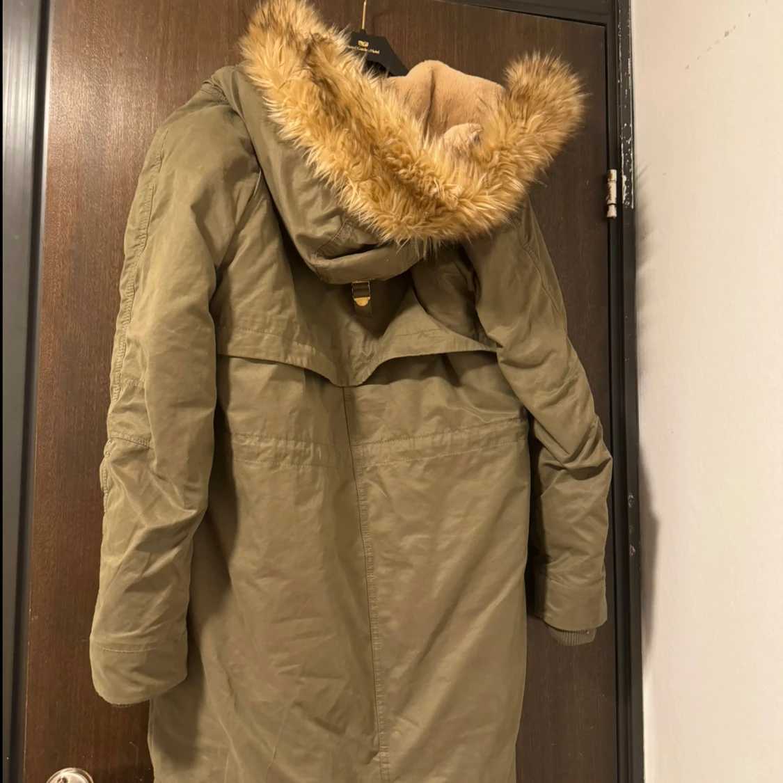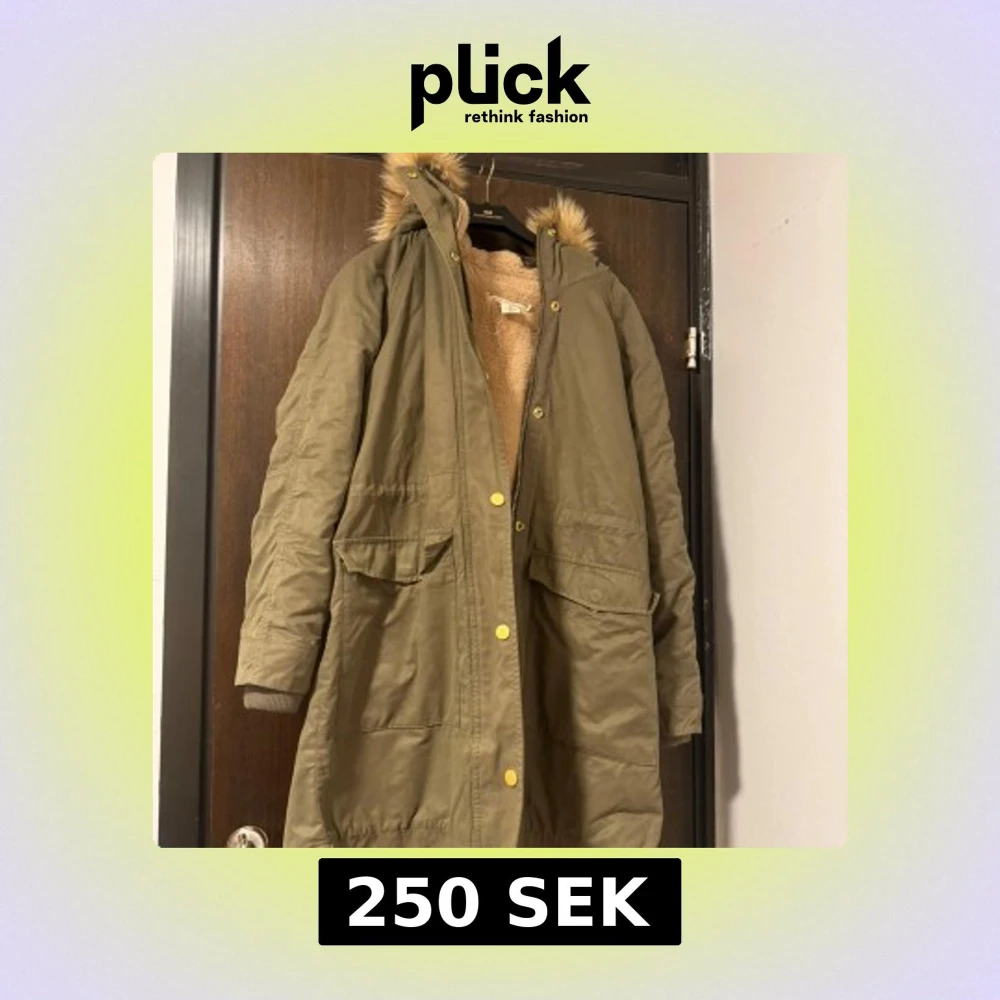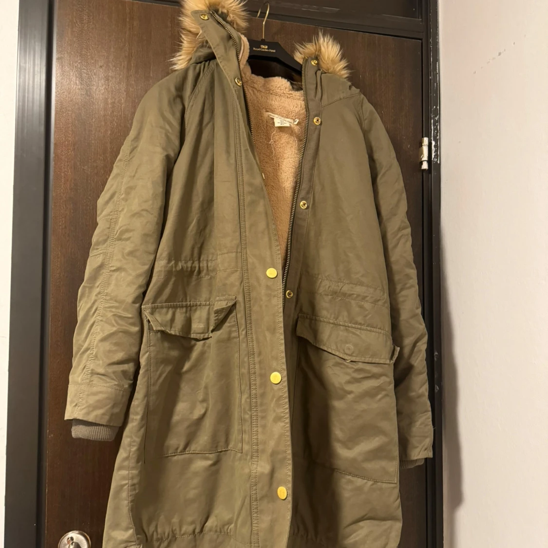 Säljer en olivgrön parkajacka med mysigt foder och huva med fuskpäls. Jackan har långa ärmar och stängs med både dragkedja och knappar. Perfekt för kyliga dagar.