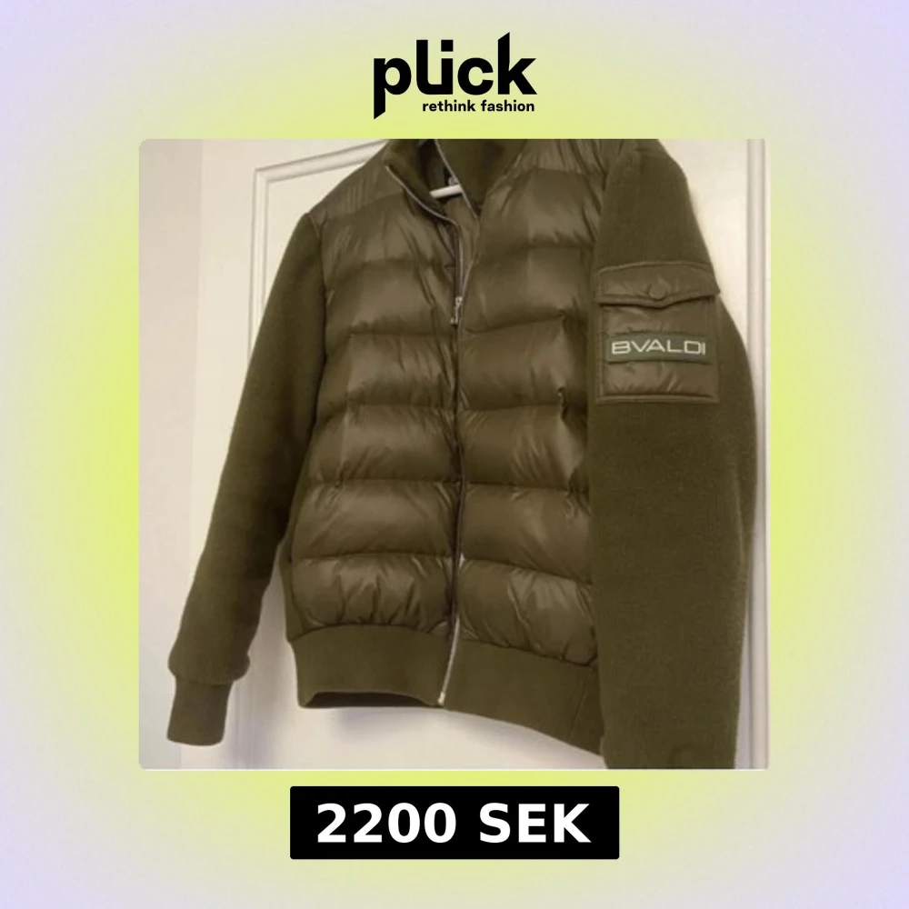 Säljer en olivgrön pufferjacka från Bvaldi med stickade ärmar och rygg. Jackan har dragkedja framtill och en ficka med lock och logotyp på ärmen. Perfekt för kyliga dagar och riktigt snygg streetstil.