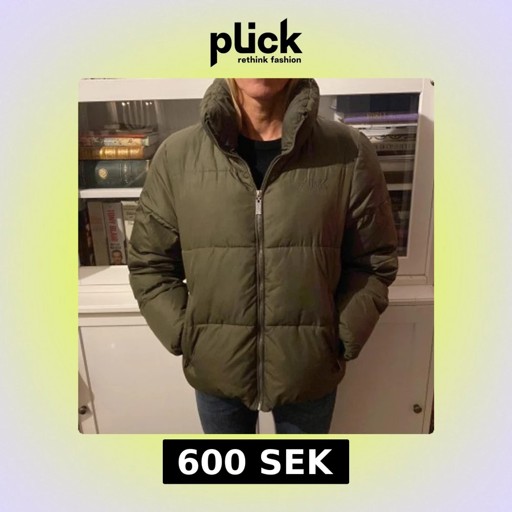 Säljer en olivgrön pufferjacka från Zink med dragkedja framtill. Jackan har en hög krage och långa ärmar, perfekt för kyliga dagar. Den är stilren och enkel att matcha med olika outfits.