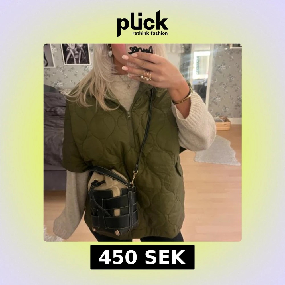 Säljer en olivgrön quiltad poncho med halv dragkedja framtill. Västen har en loose passform och är perfekt att slänga över en stickad tröja. Materialet är syntet och dun, vilket gör den både lätt och varm. Enkel och stilren design utan synliga loggor.