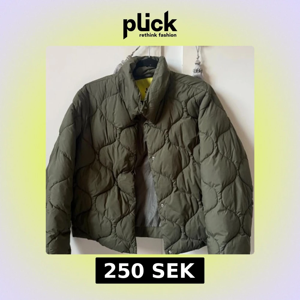 Säljer en olivgrön pufferjacka med quiltat mönster och hög krage. Jackan har tryckknappar framtill och en cool, oversized passform. Perfekt för kyliga dagar när du vill vara både varm och snygg.