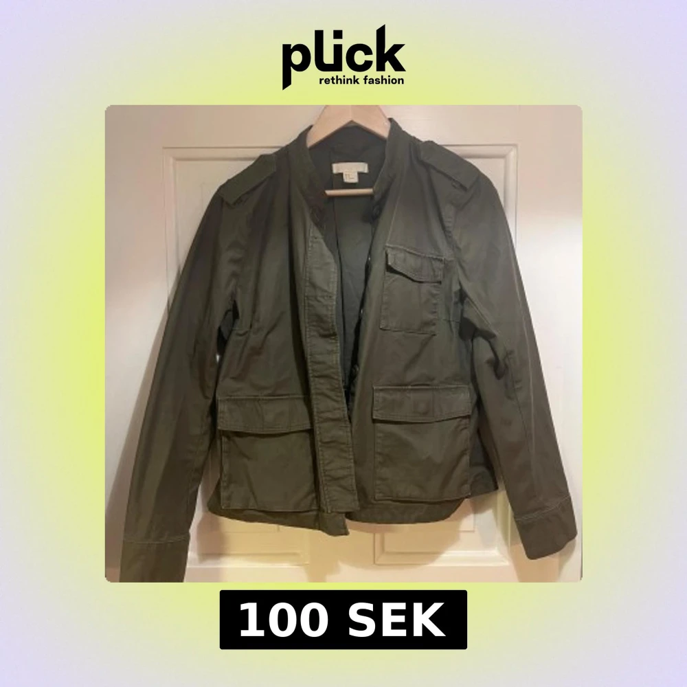 Säljer en olivgrön utilityjacka från H&M med flera stora fickor framtill och axelklaffar. Jackan har lång ärm, rak passform och stängs med dolda tryckknappar. Perfekt för lager-på-lager under höst och vår. En av knapparna är trasig, men syns inte när den är stängd.